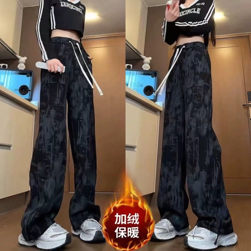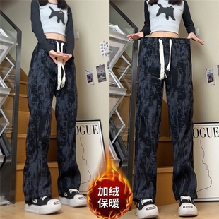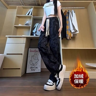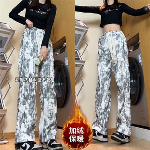 加绒加厚阔腿休闲裤 宽松直筒运动长裤 女秋冬季 灯芯绒扎染泼墨卫裤