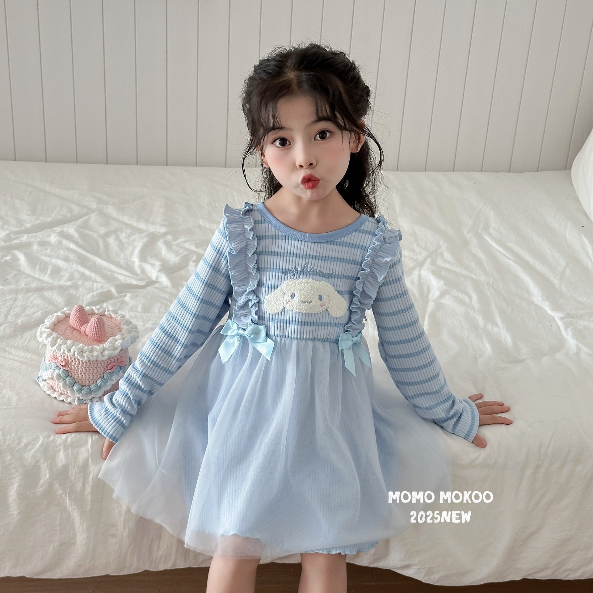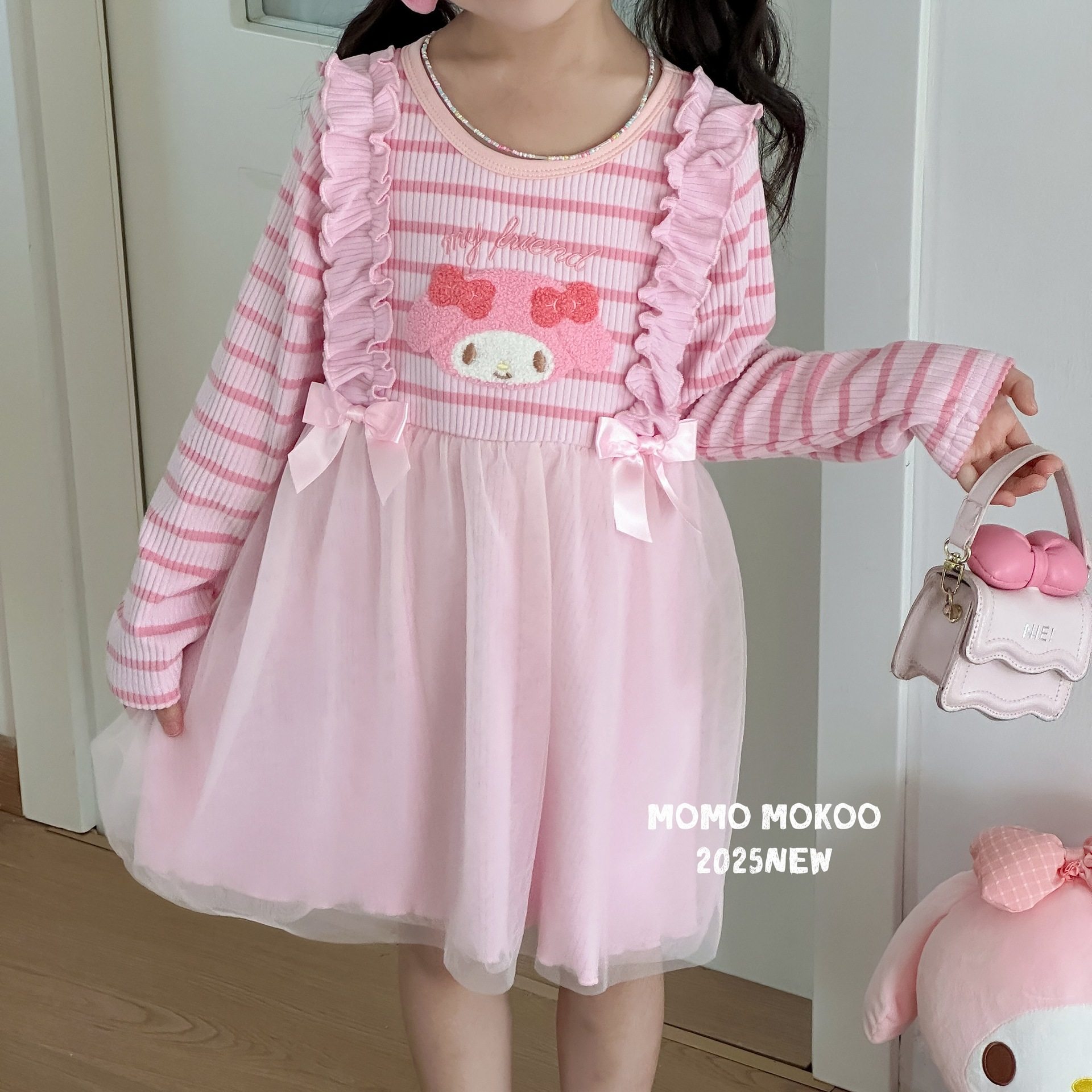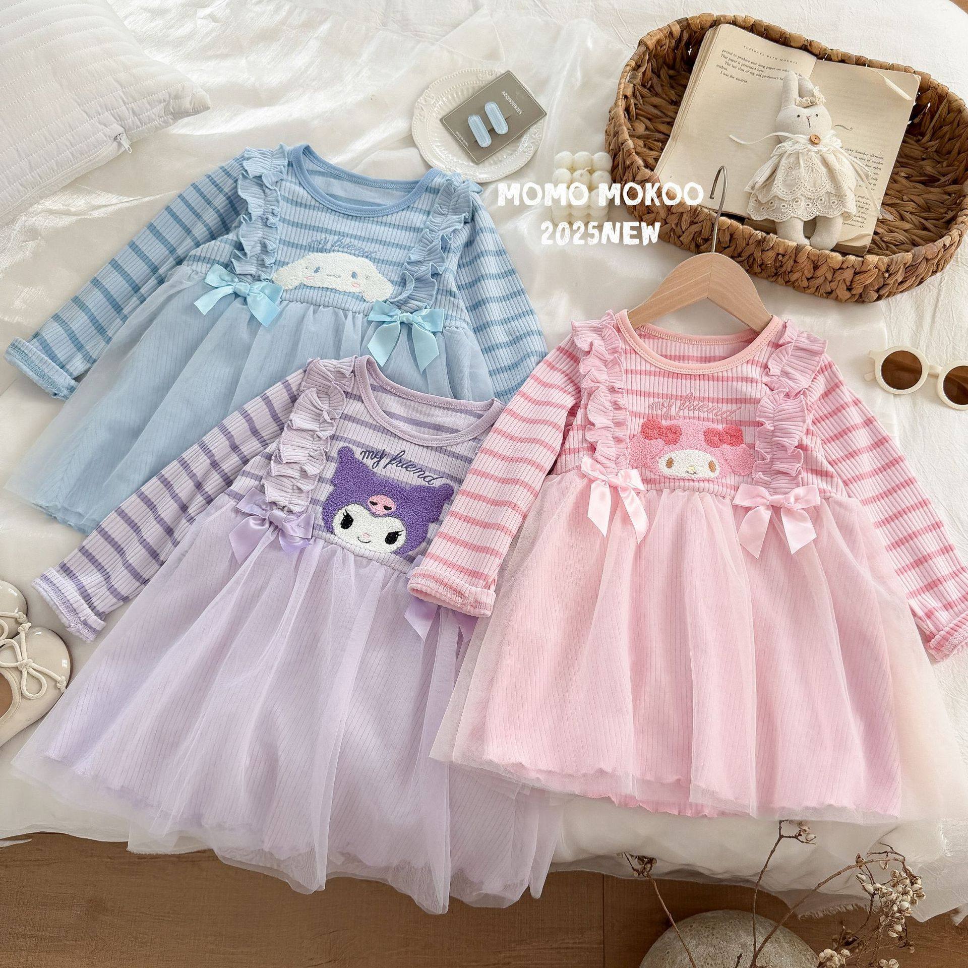 女童春秋装 连衣裙儿童洋气条纹公主纱纱裙可爱卡通刺绣裙子潮 长袖