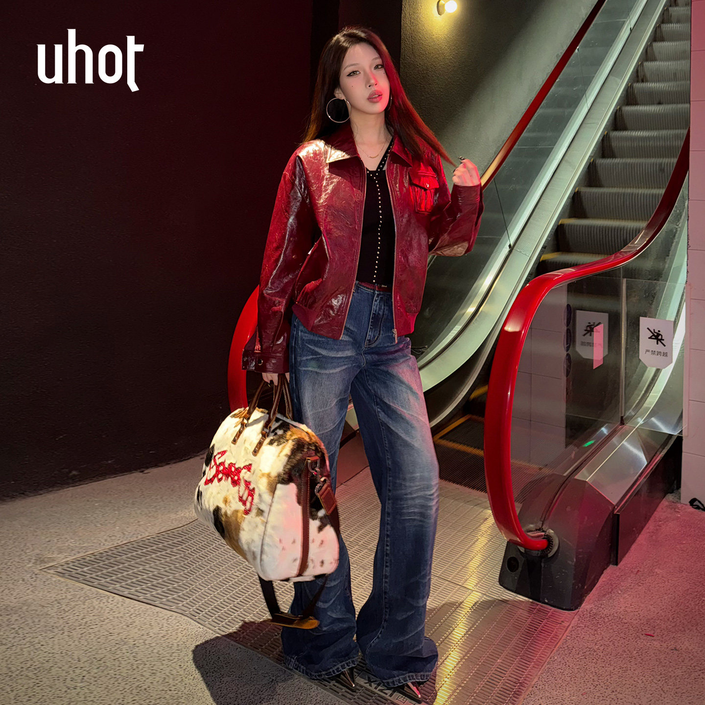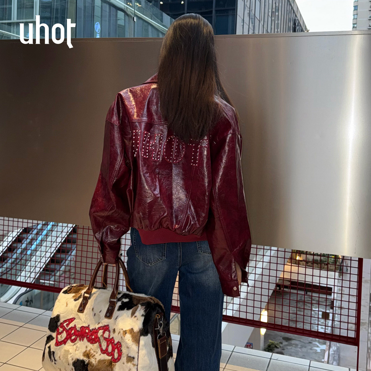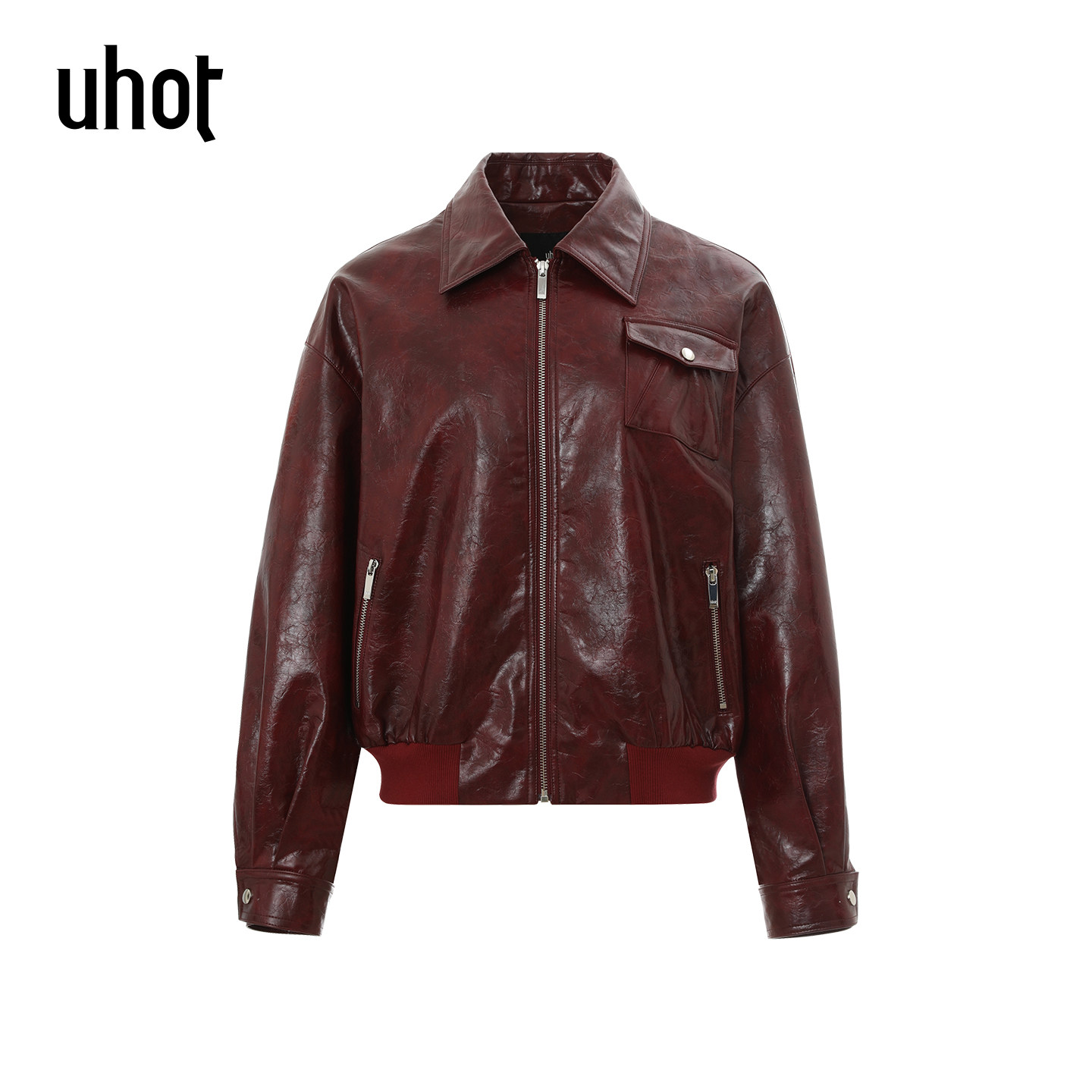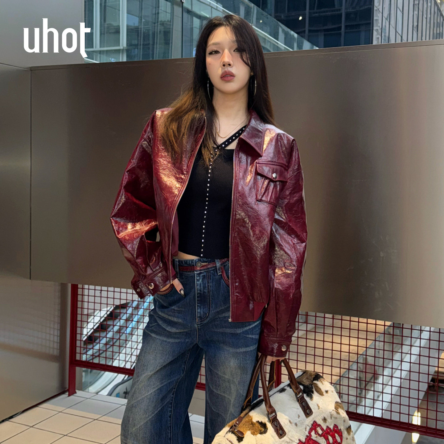 uhot 皮夹克钉珠廓形皮衣外套女UWLS1W601M 诱货26春红色复古短款