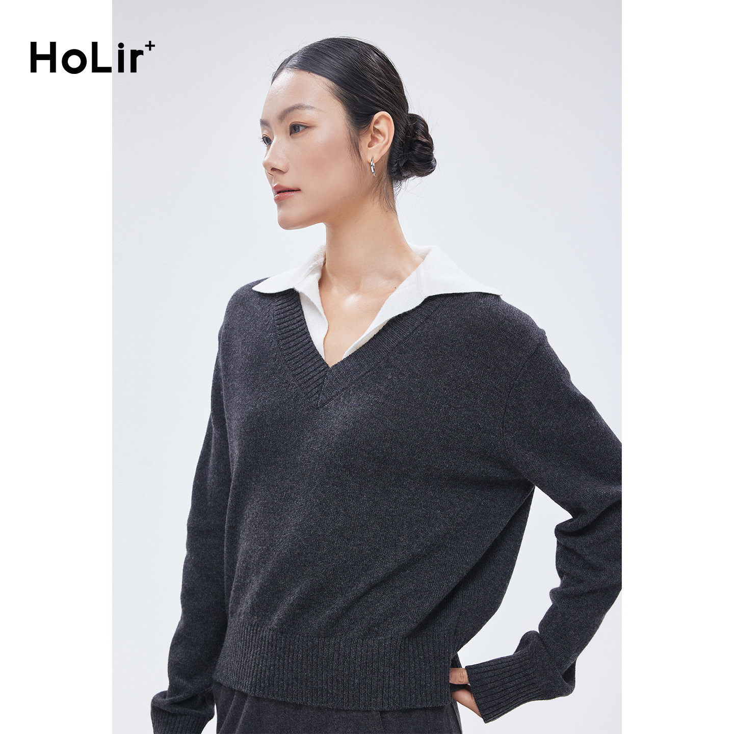 洪陵2030系列羊绒羊毛假两件V领套头衫 女