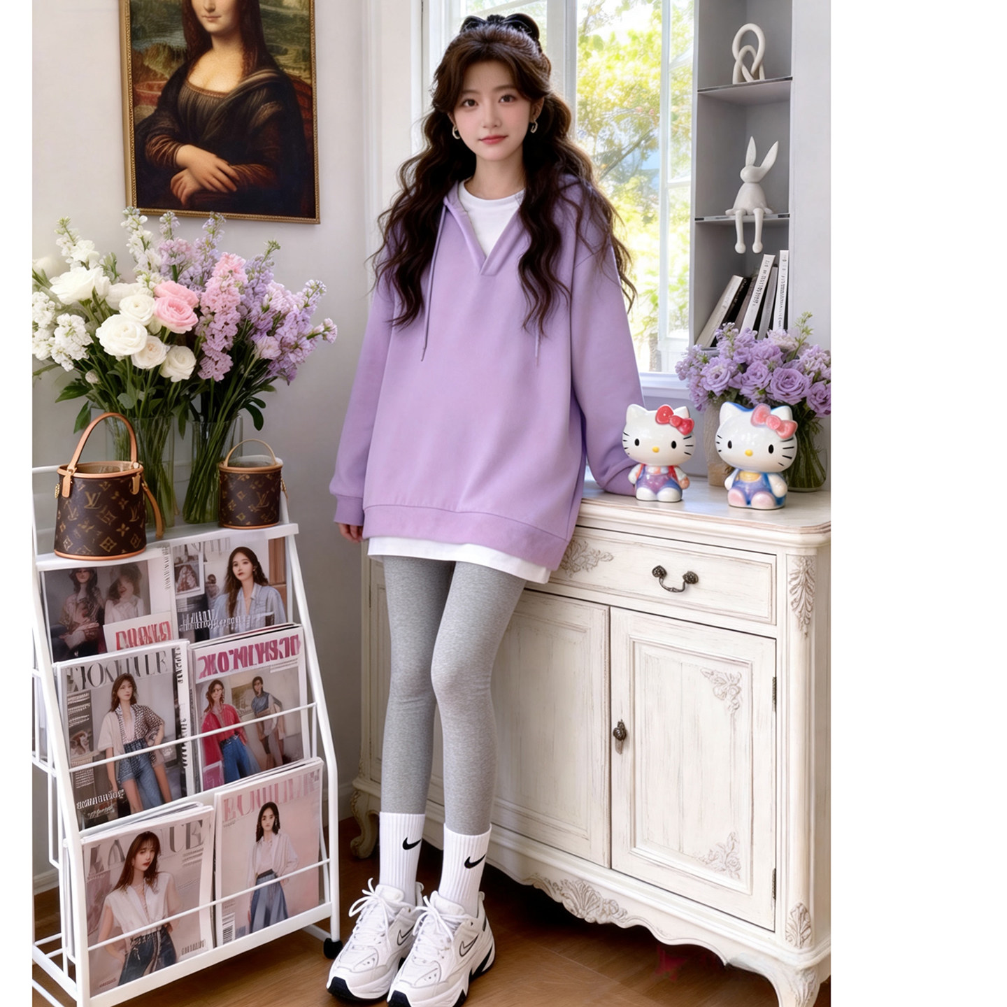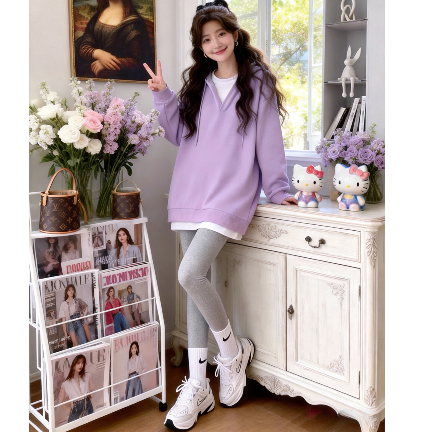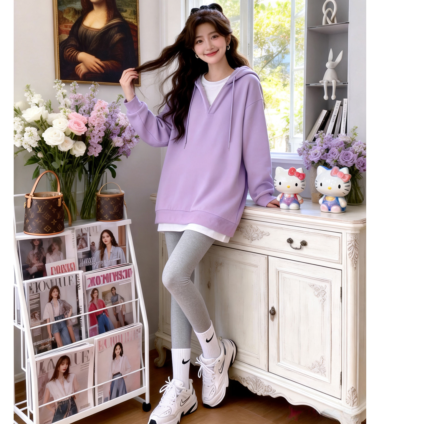 宽松紫色孕期穿搭拼接连帽卫衣两件套女 韩版 孕妇套装 春秋2026新款