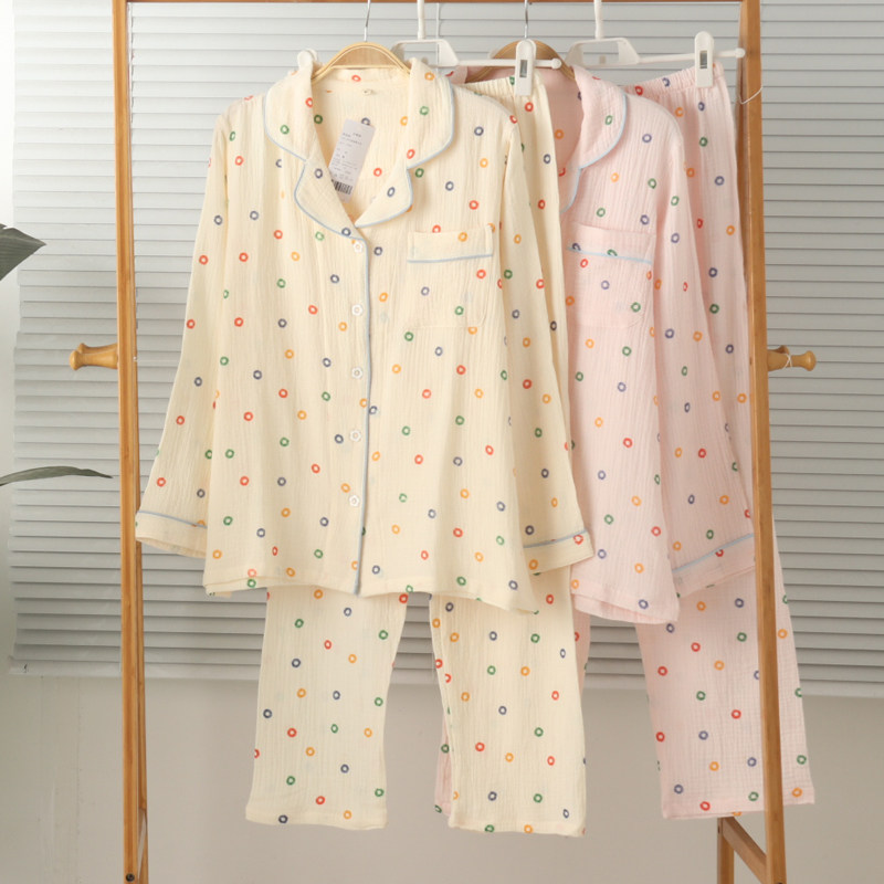 睡衣家居服套装 长裤 春夏透气 女纯棉双层纱布绉棉开身长袖 特价