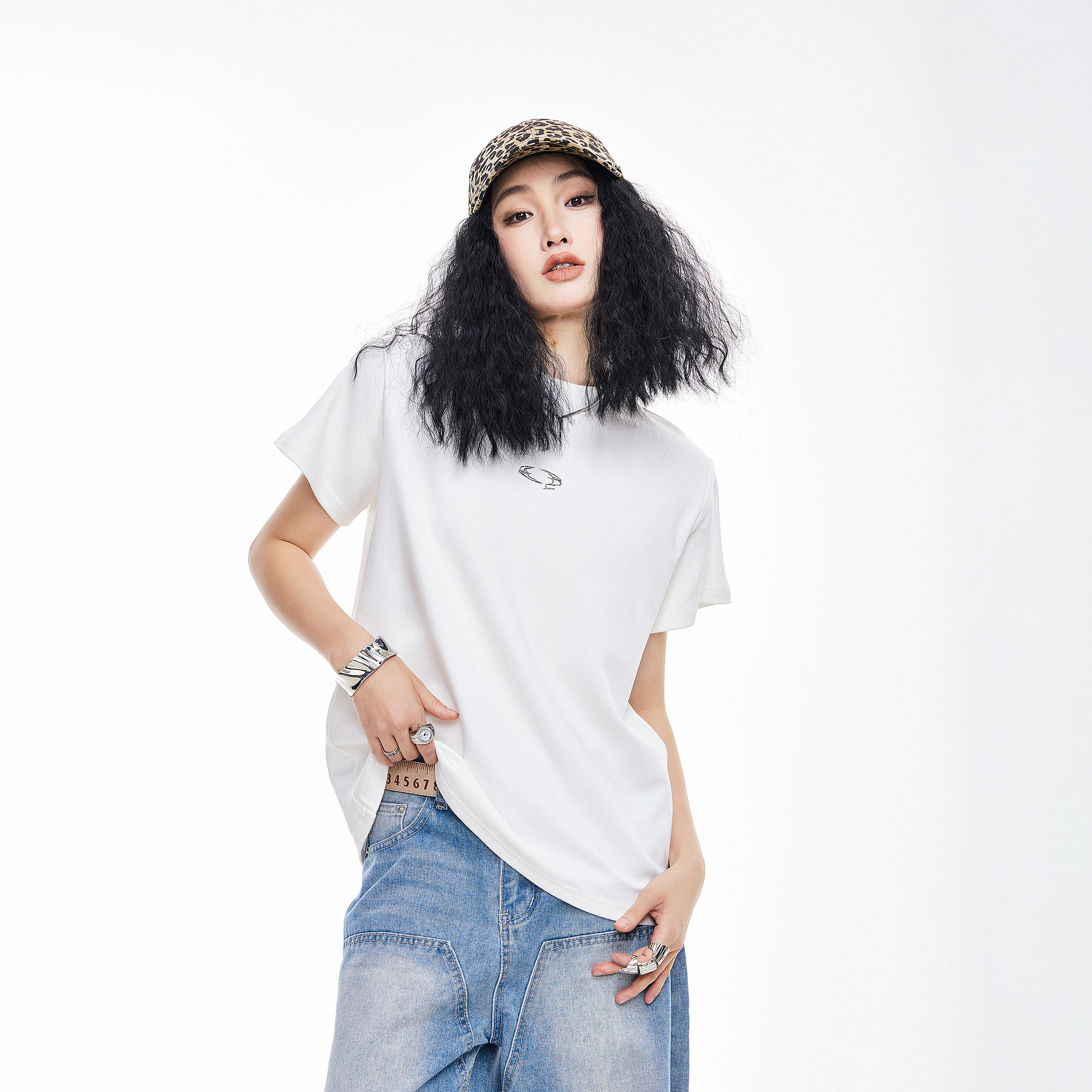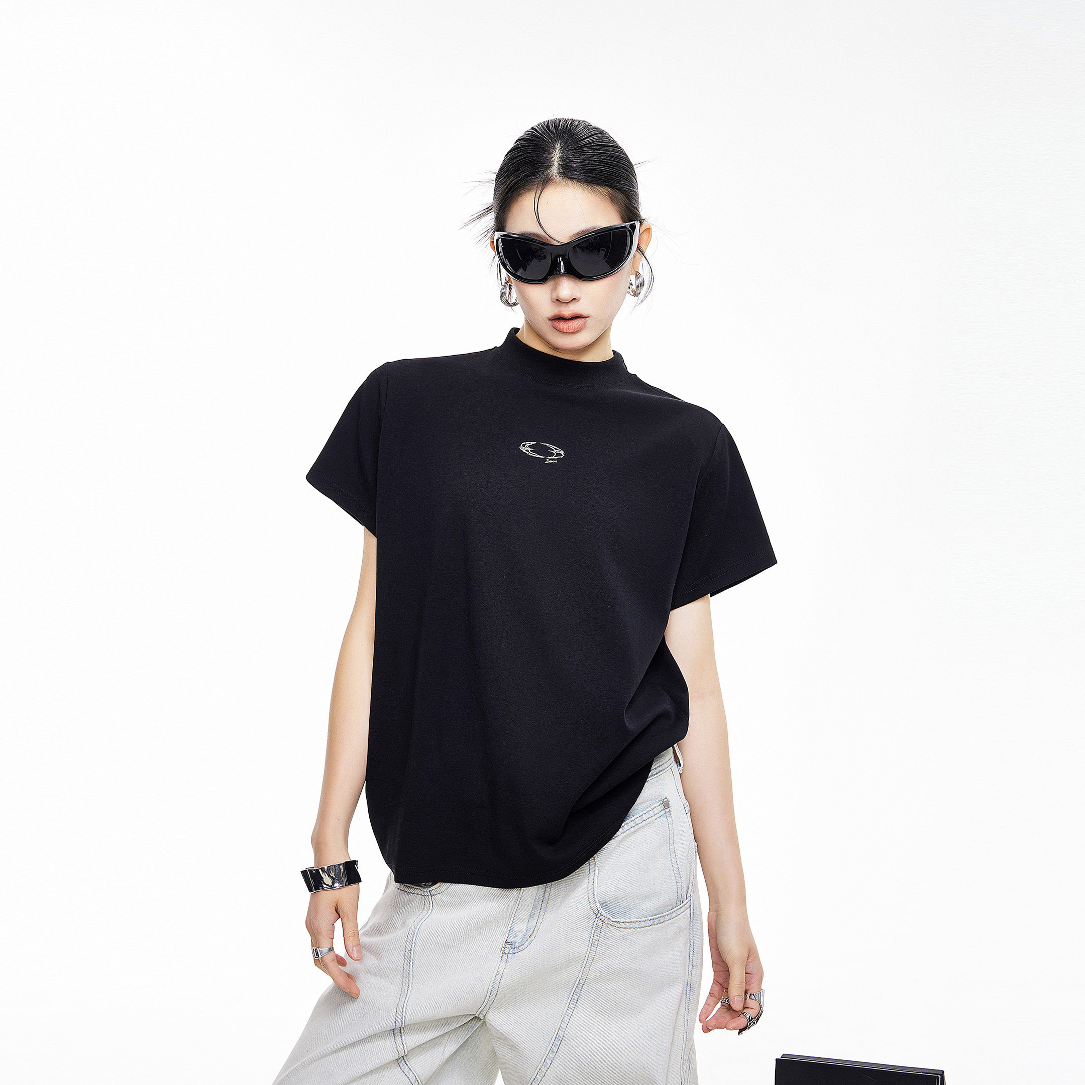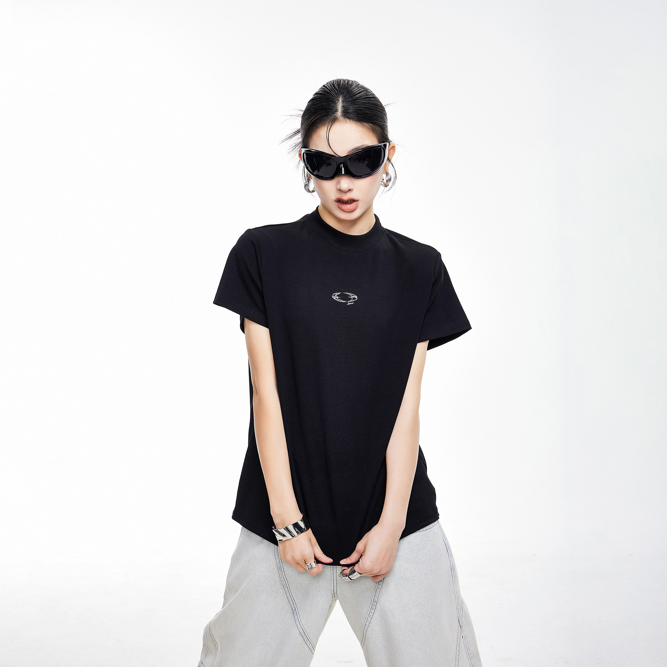 T恤女夏季 花卉刺绣正肩短袖 新款 修身 上衣 ICH 半高领半袖 MODE美式