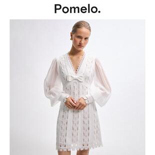 连衣裙 温柔风小个子短款 Pomelo 白色蕾丝连衣裙女V领蝴蝶结长袖