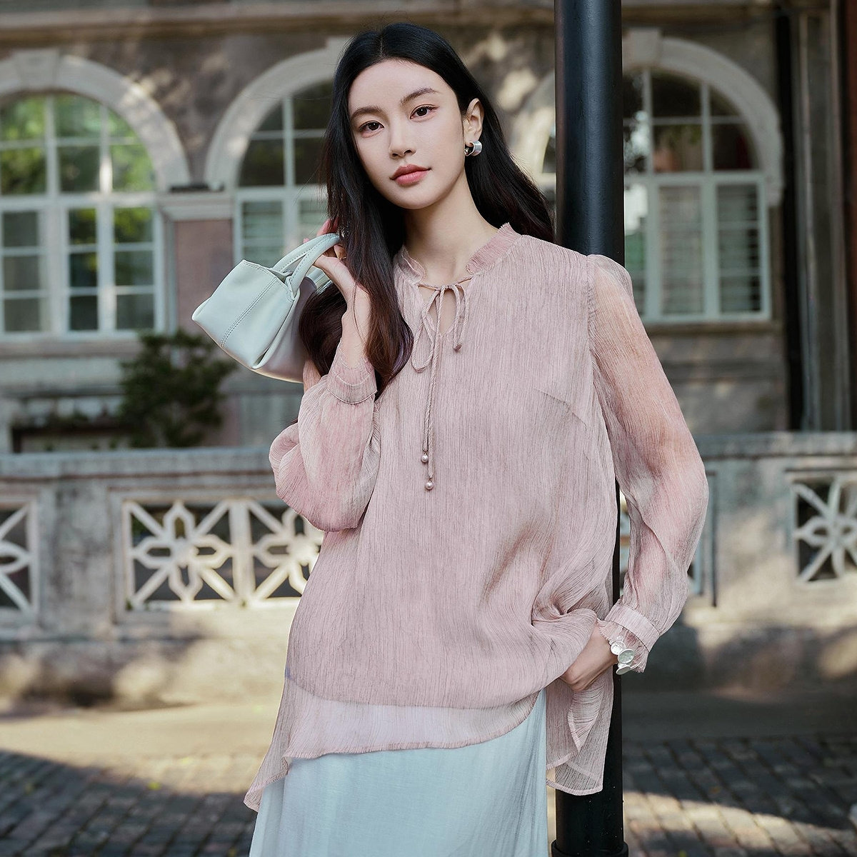 上装 粉色轻奢系带领100%真丝长袖 女 2026春新款 FINITY菲妮迪雪纺衫