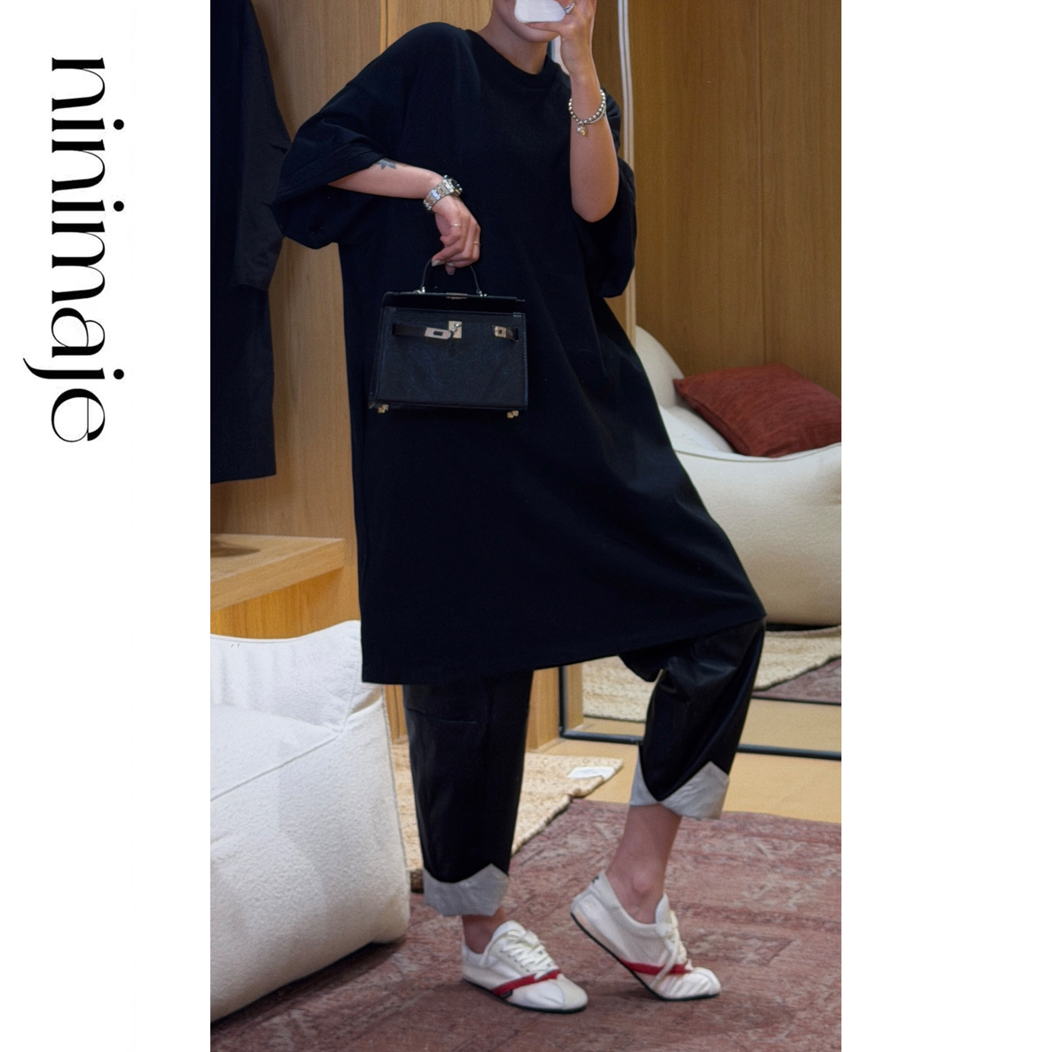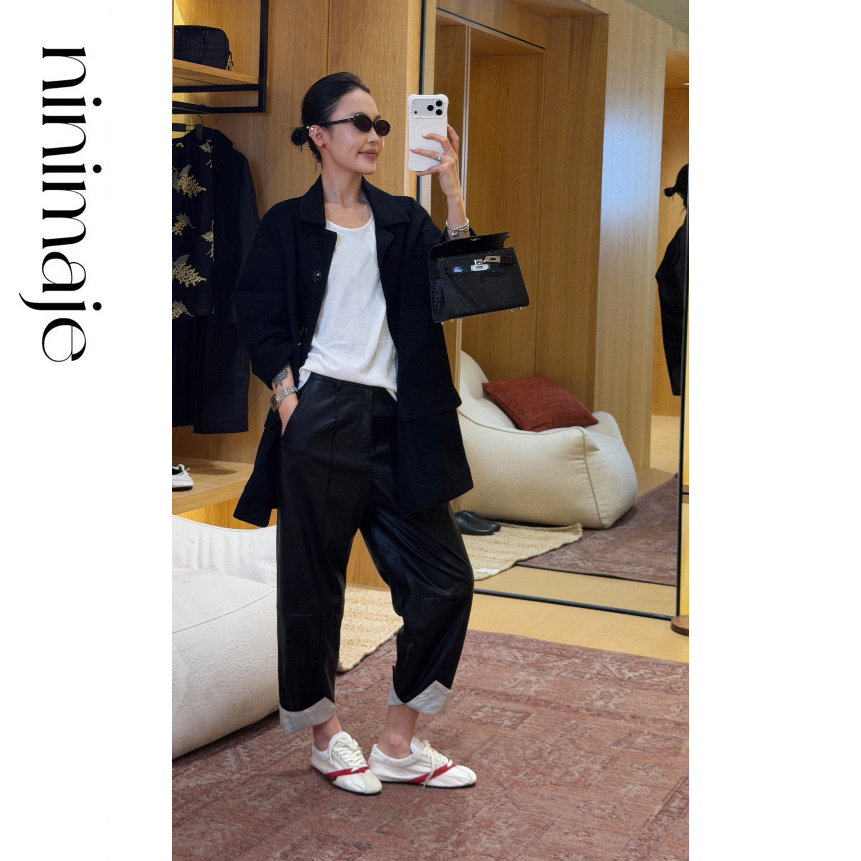 裤 高级感裤 直筒皮裤 时尚 子 女宽松阔腿裤 NANBEIBEI南北贝黑色时装