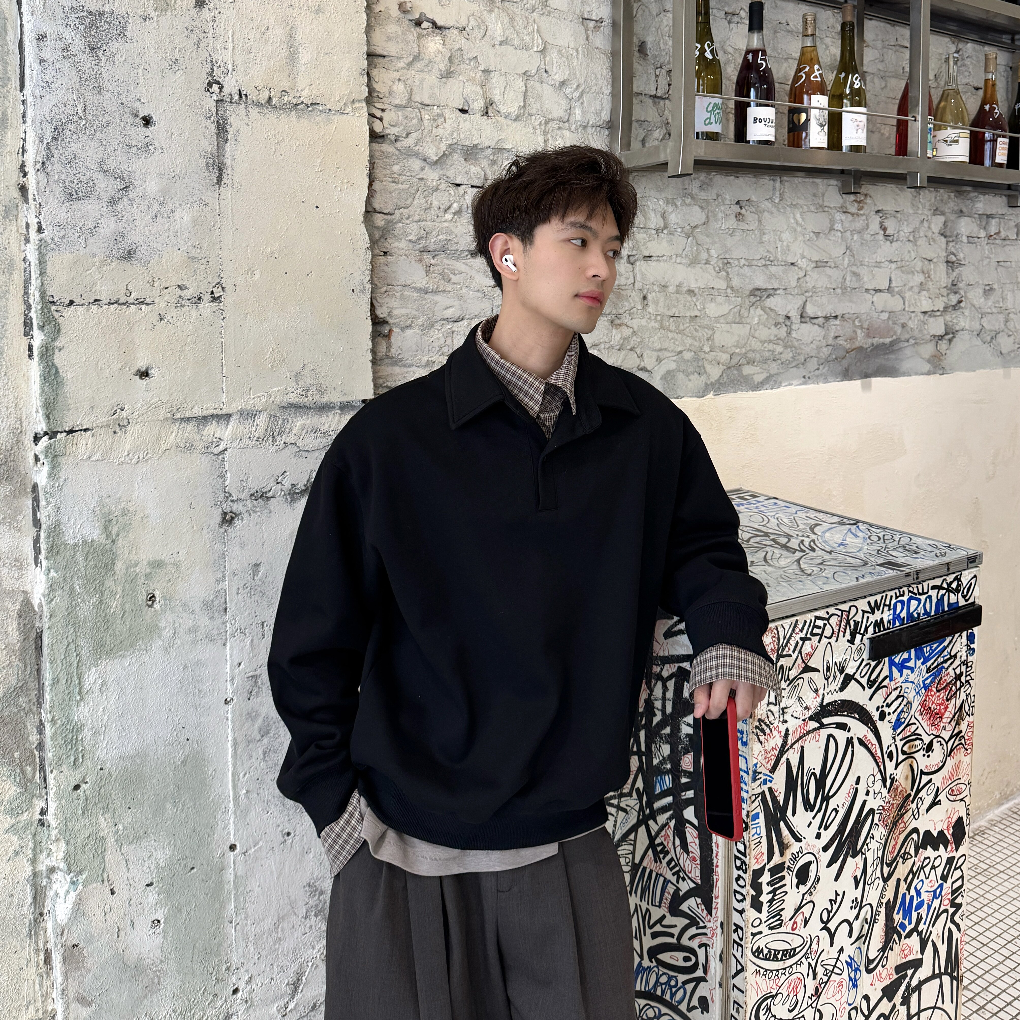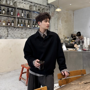 慵懒极简风上衣 卫衣男重磅长袖 飞型记假两件美式 风黑色翻领polo衫