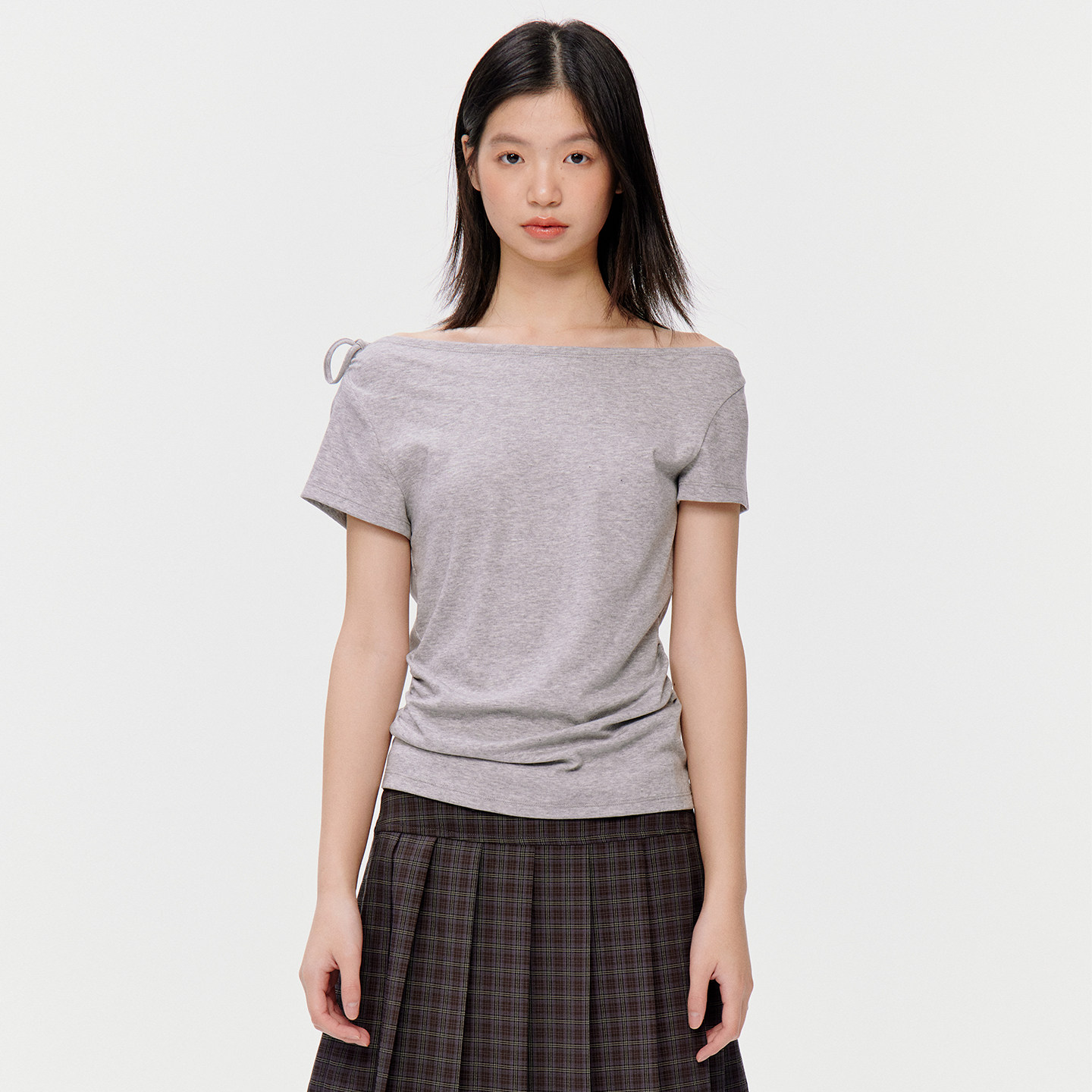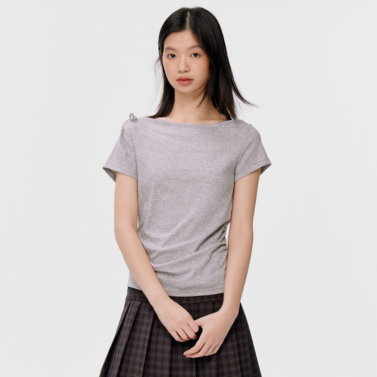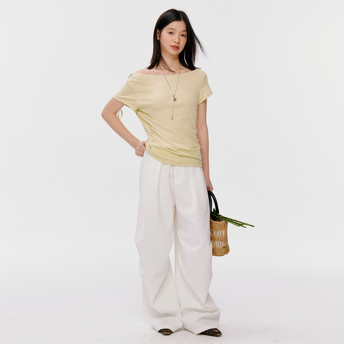 T恤 显瘦斜肩短袖 omont蛋挞家复古一字肩纯色外穿上衣2026春季 修身