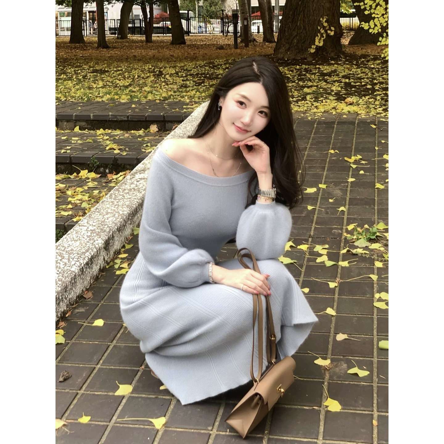 性感露肩斜肩紧身连衣裙秋冬钓系约会短裙收腰显瘦心机气质包臀裙