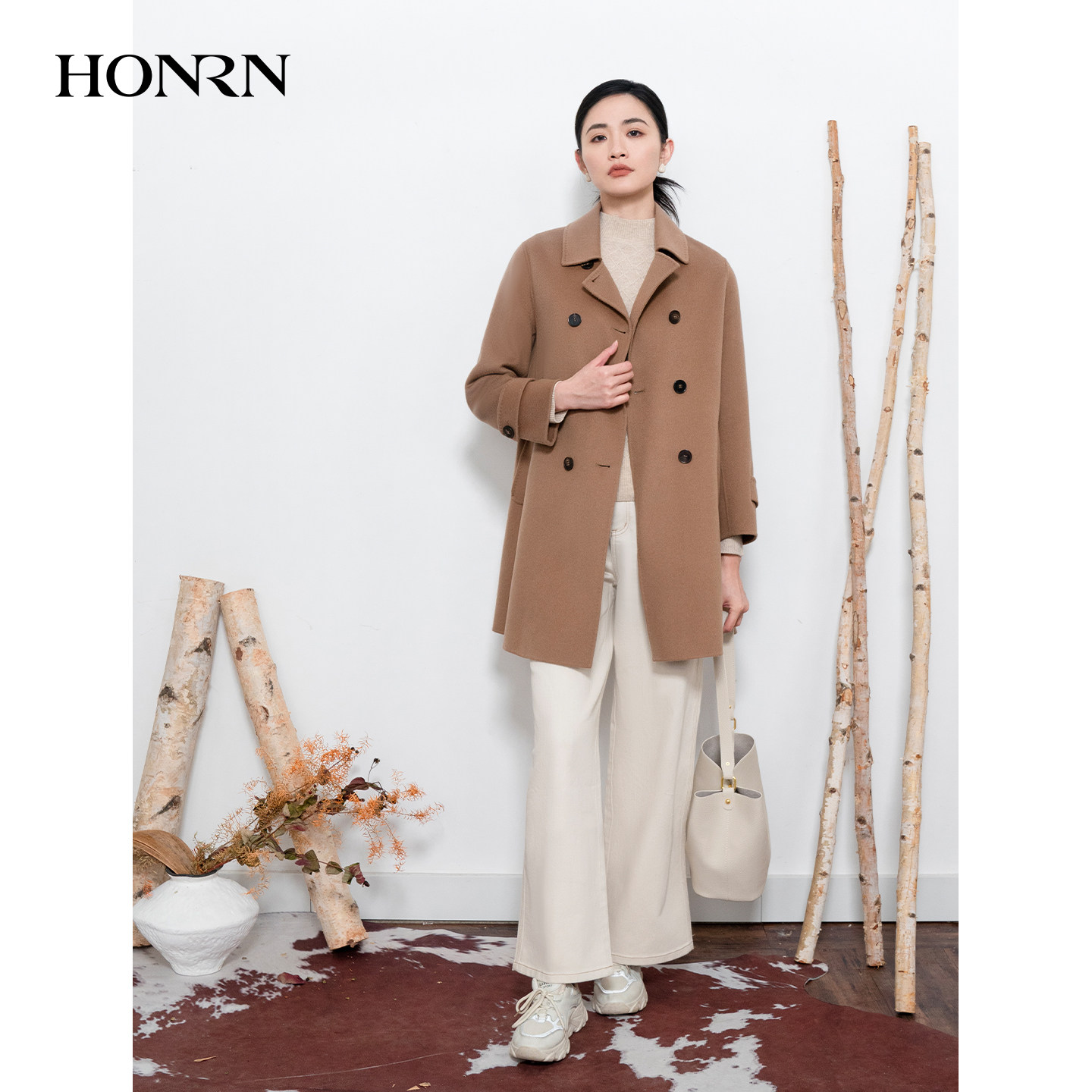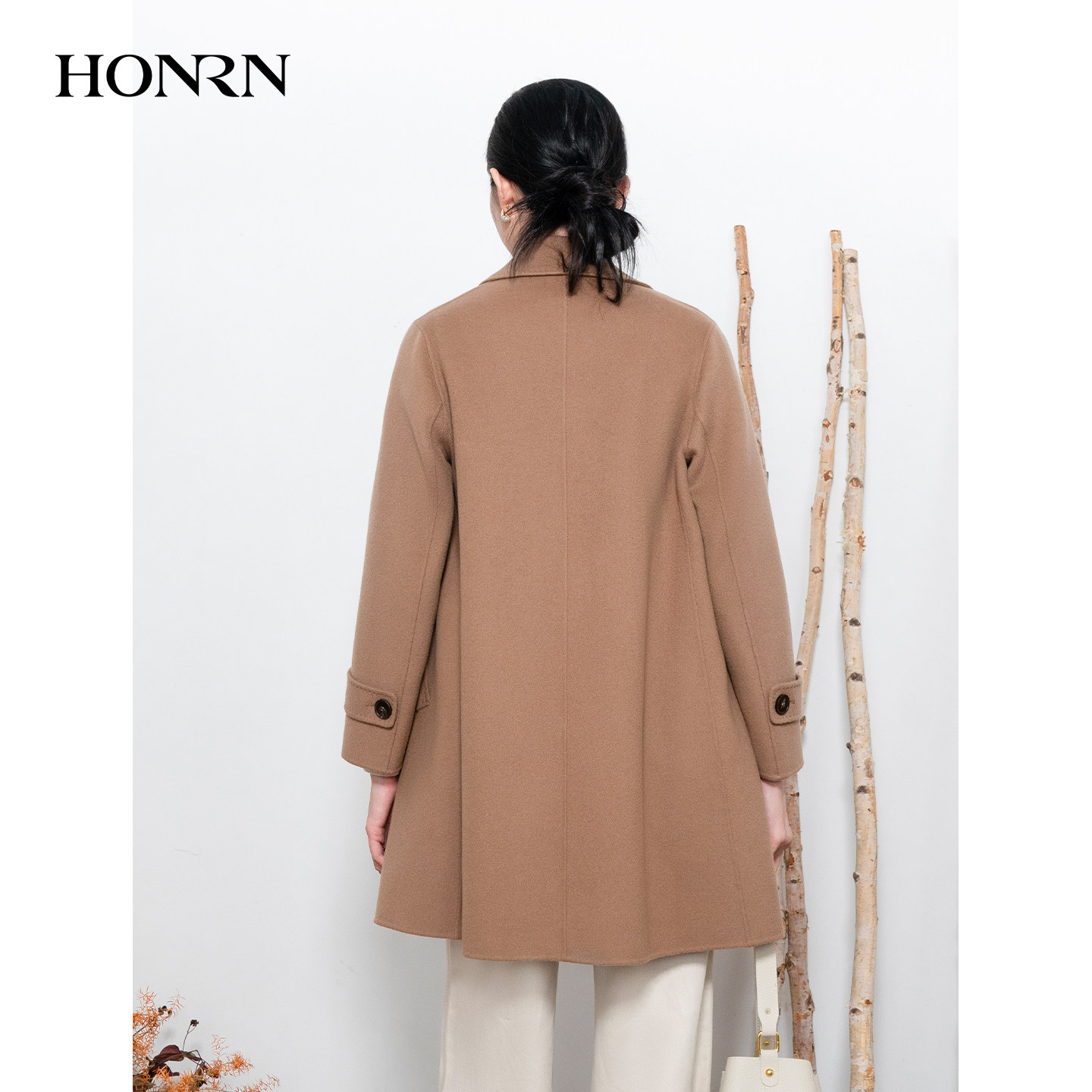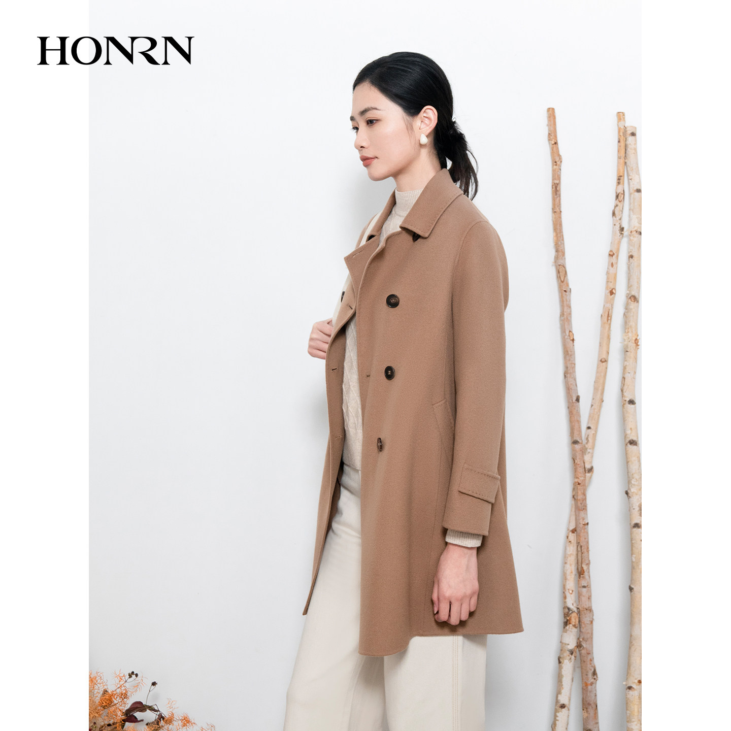 HONRN 双面羊毛呢子气质大衣外套女秋冬HI55OD937 红人翻领中长款