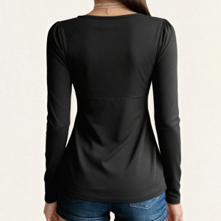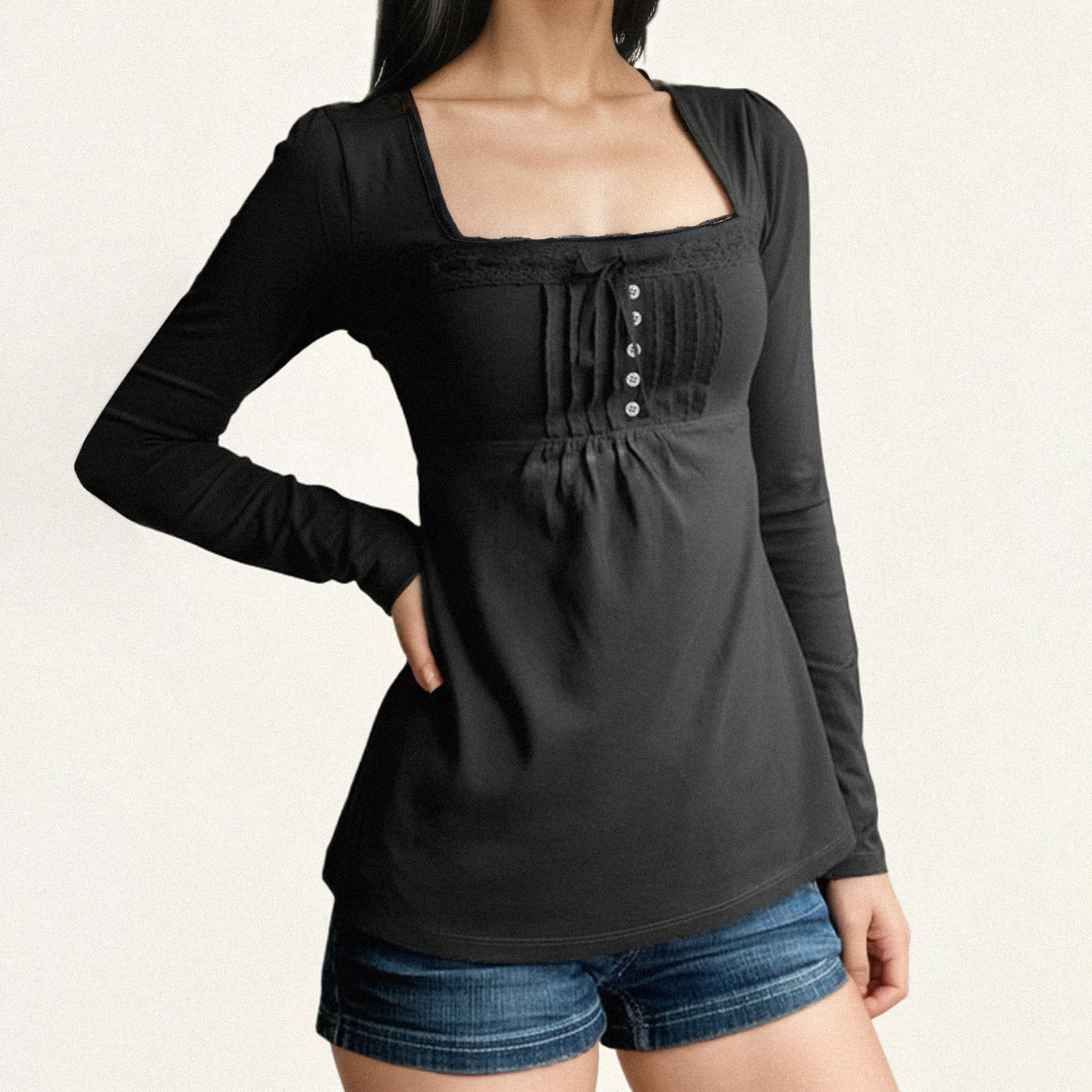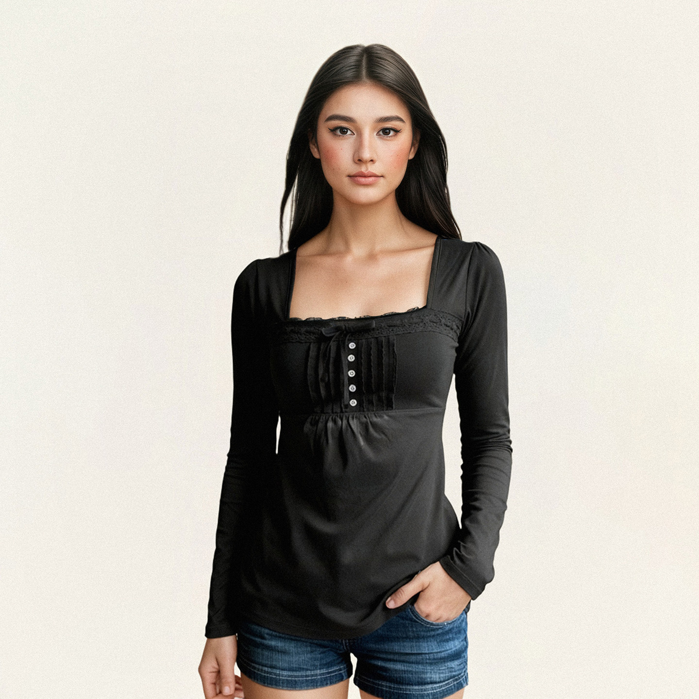 T恤2025秋冬少女感打底上衣 复古黑色拼接蕾丝方领长袖 FUNOFF 法式