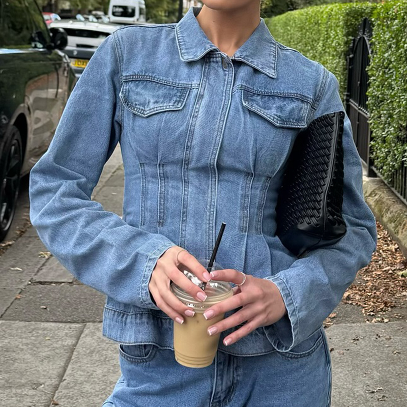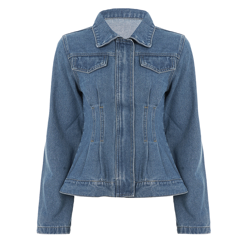 FabGirls 小众百搭显瘦休闲上衣秋 复古做旧束腰压褶拉链牛仔外套