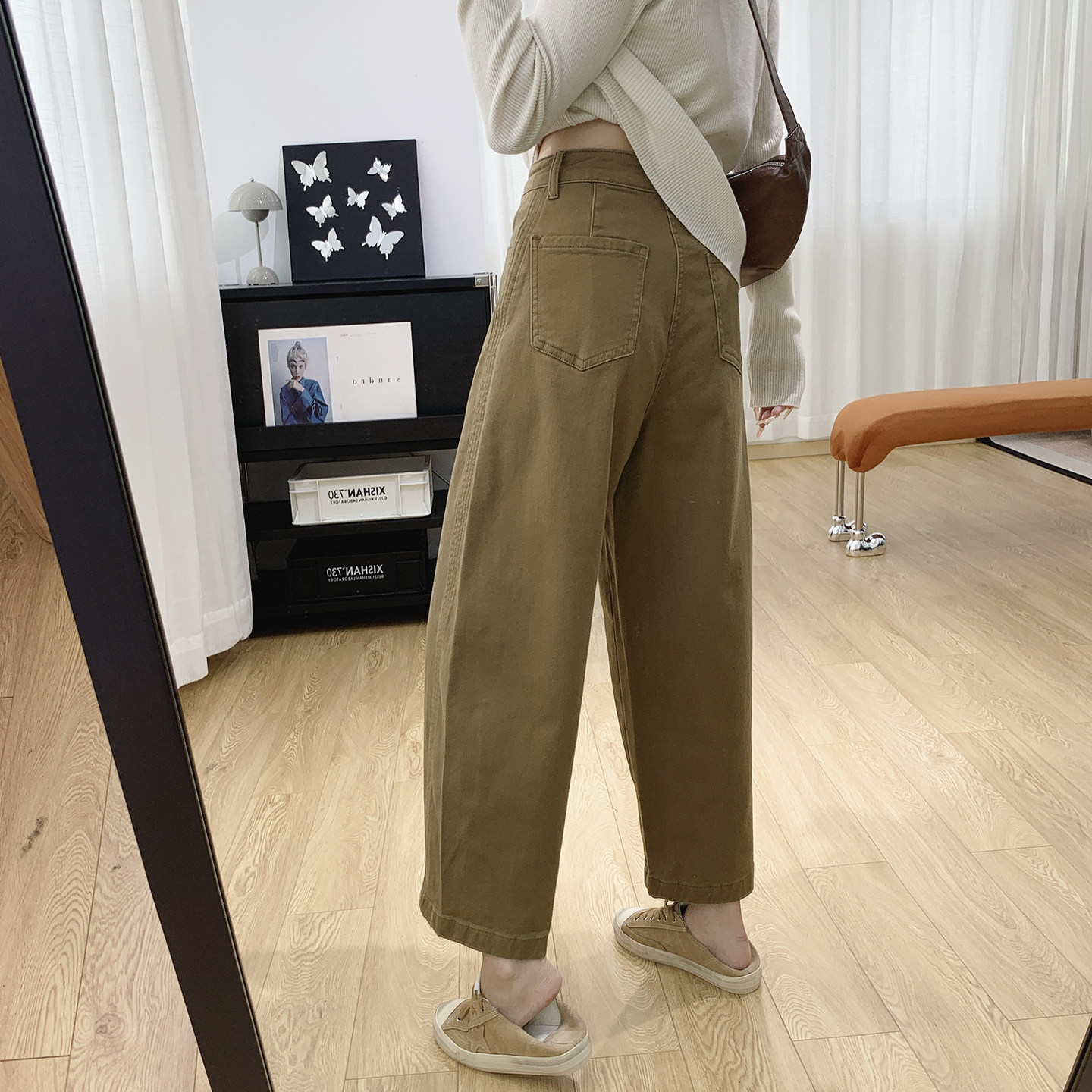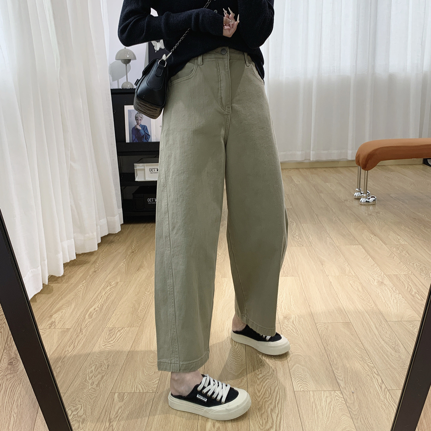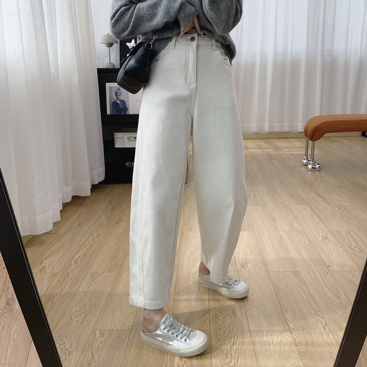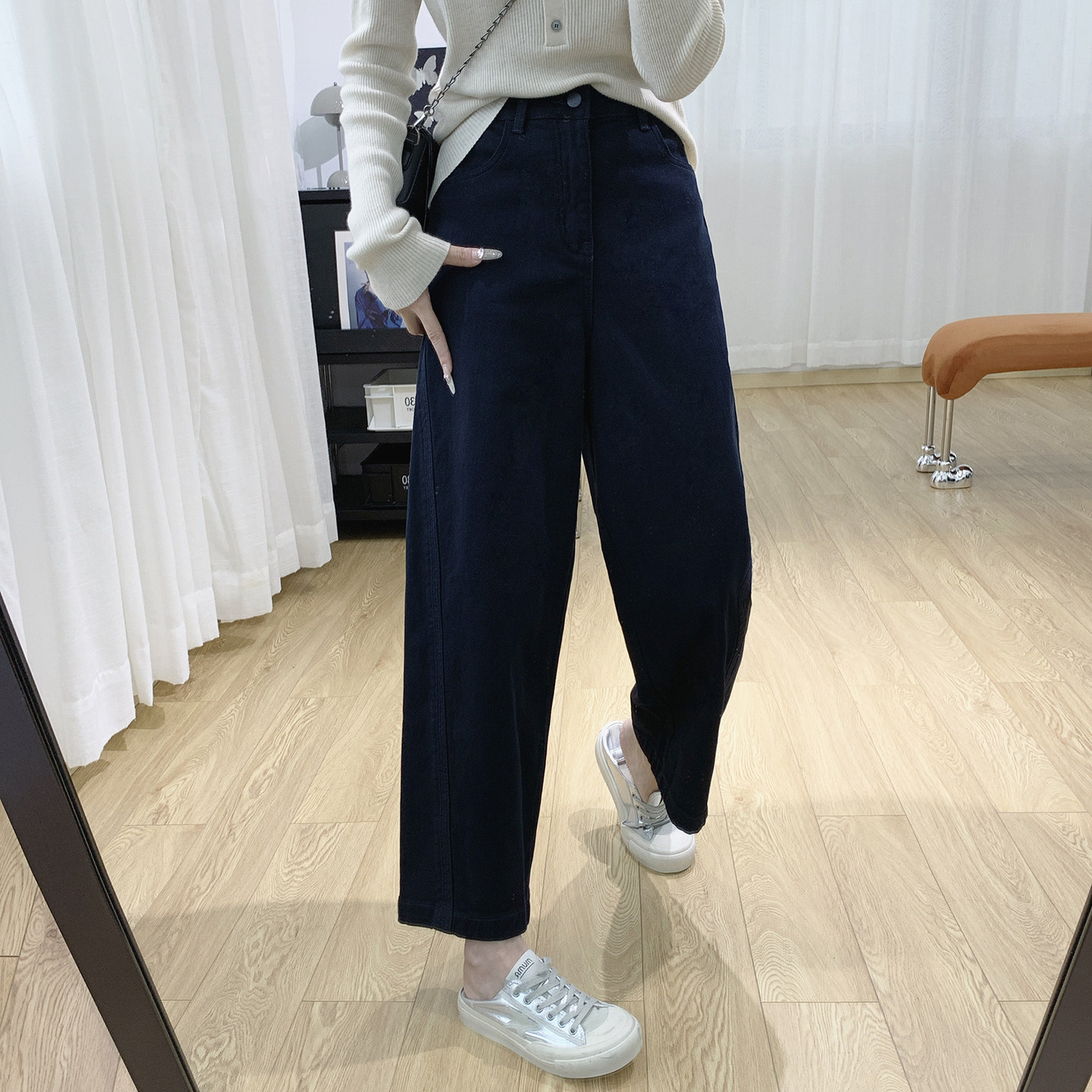 子 薄绒梨型身材裤 高腰显瘦磨毛抓绒牛仔裤 女秋冬宽松老爹哈伦裤