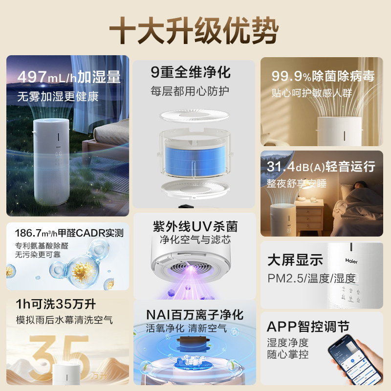 美 空气净化器家用卧室除甲醛菌二手烟加湿净化一体机RX600ProH