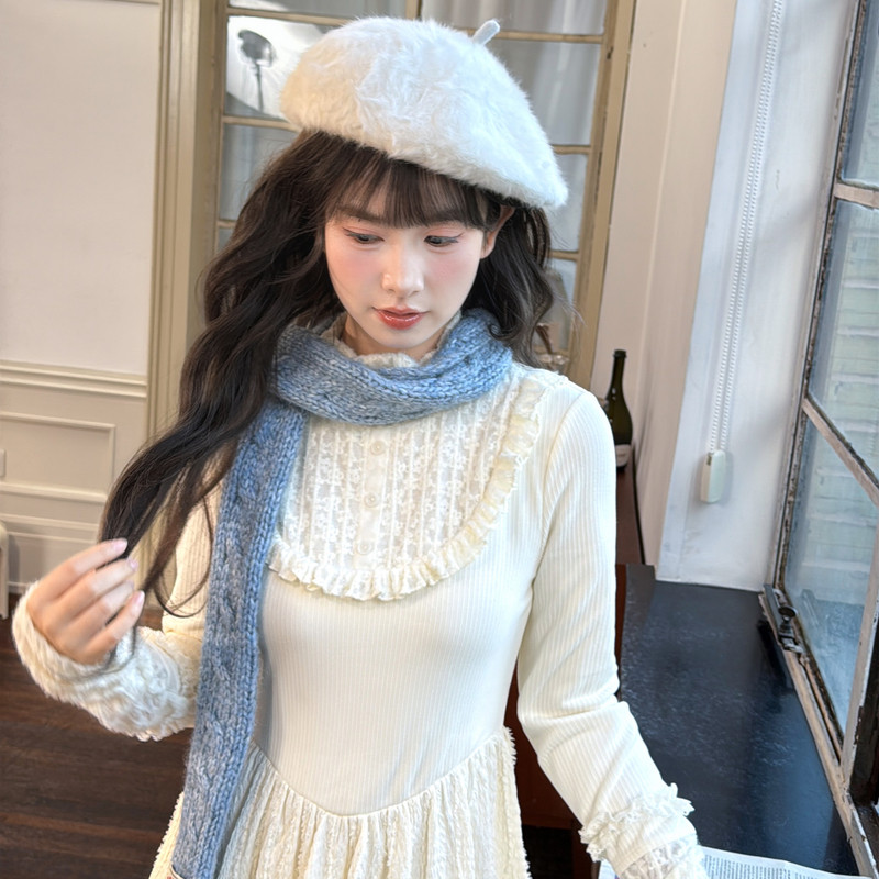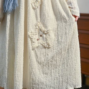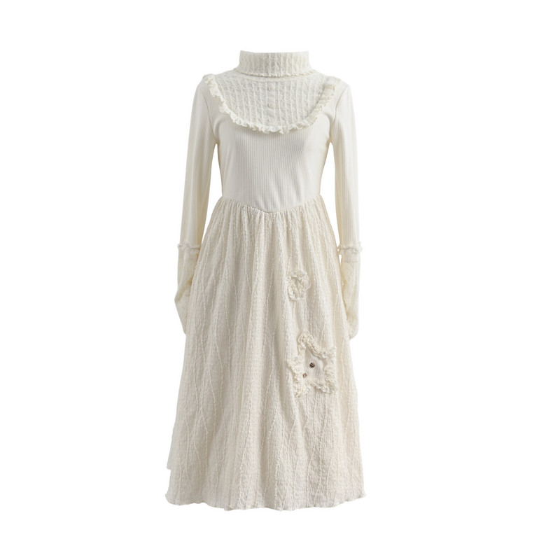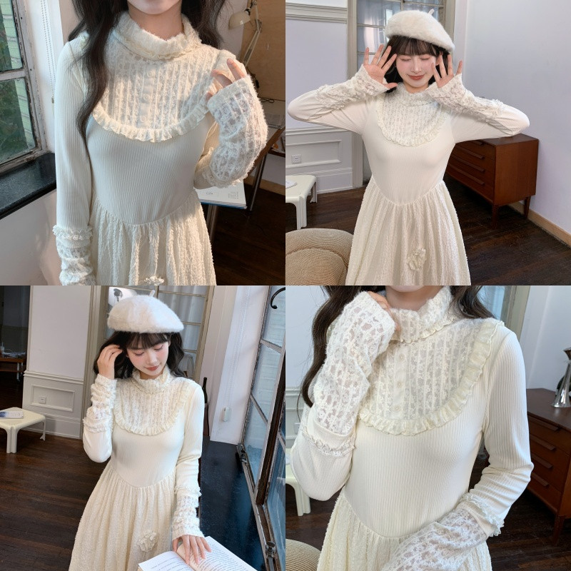 森女部落甜美蕾丝拼接长袖 A字裙冬 连衣裙女高领温柔气质百搭修身