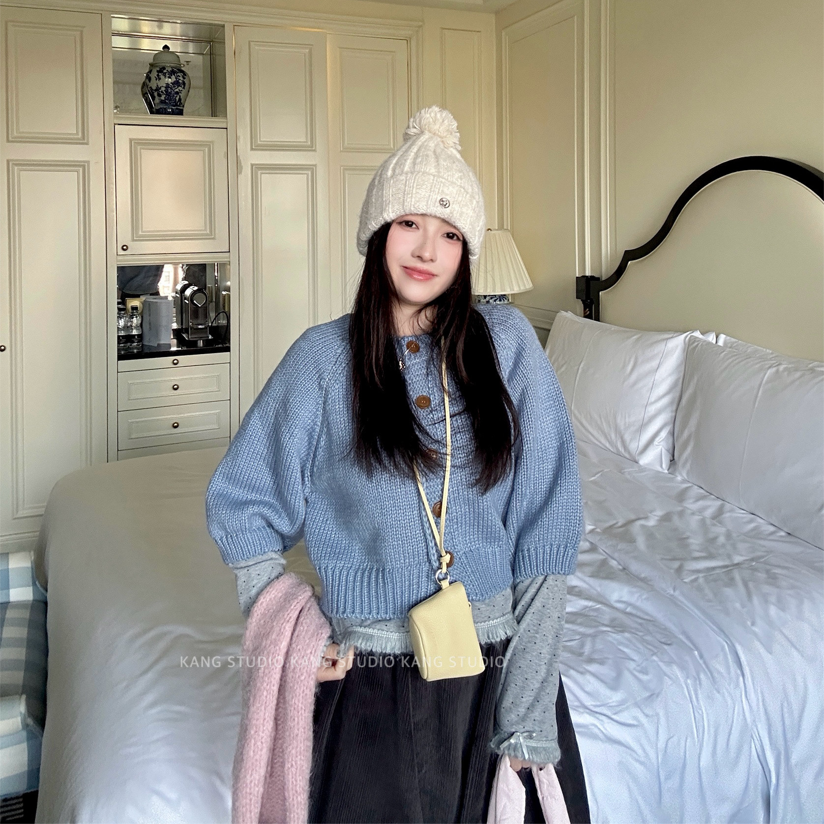 含羊毛 康康 毛衣上衣女温柔外穿针织衫 复古叠穿短袖 温柔韩风