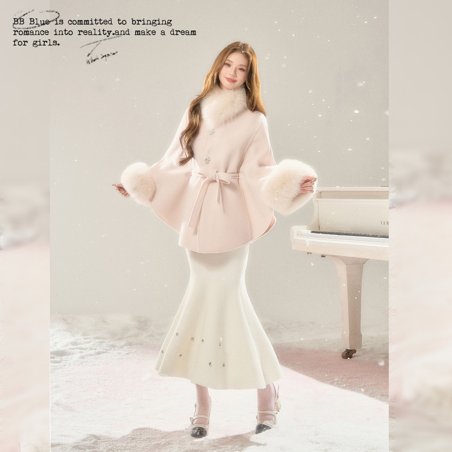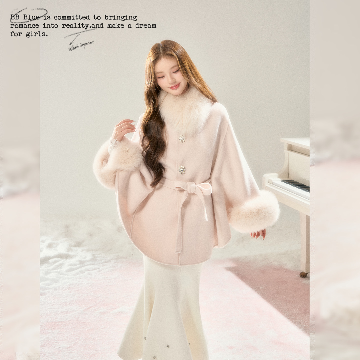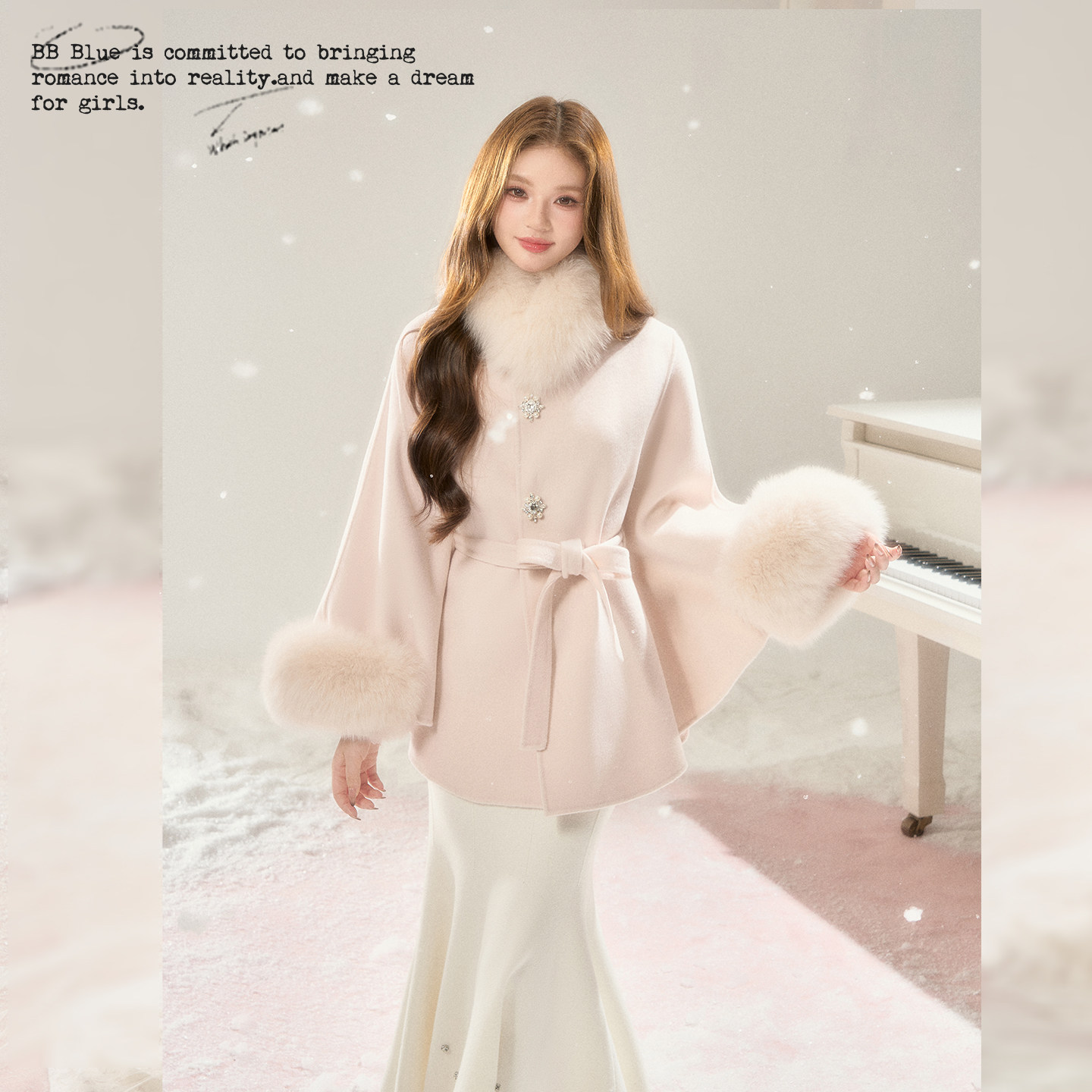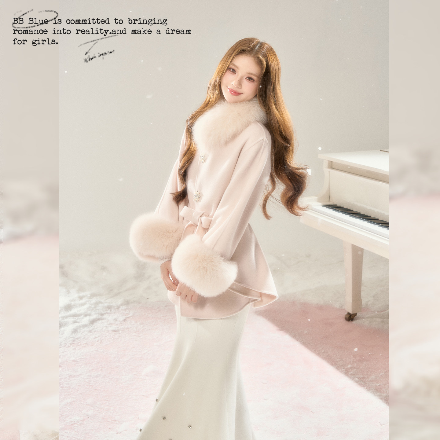粉毛领收腰100%羊毛呢外套毛领毛袖 昭和千金 秋冬高级感 BLUE