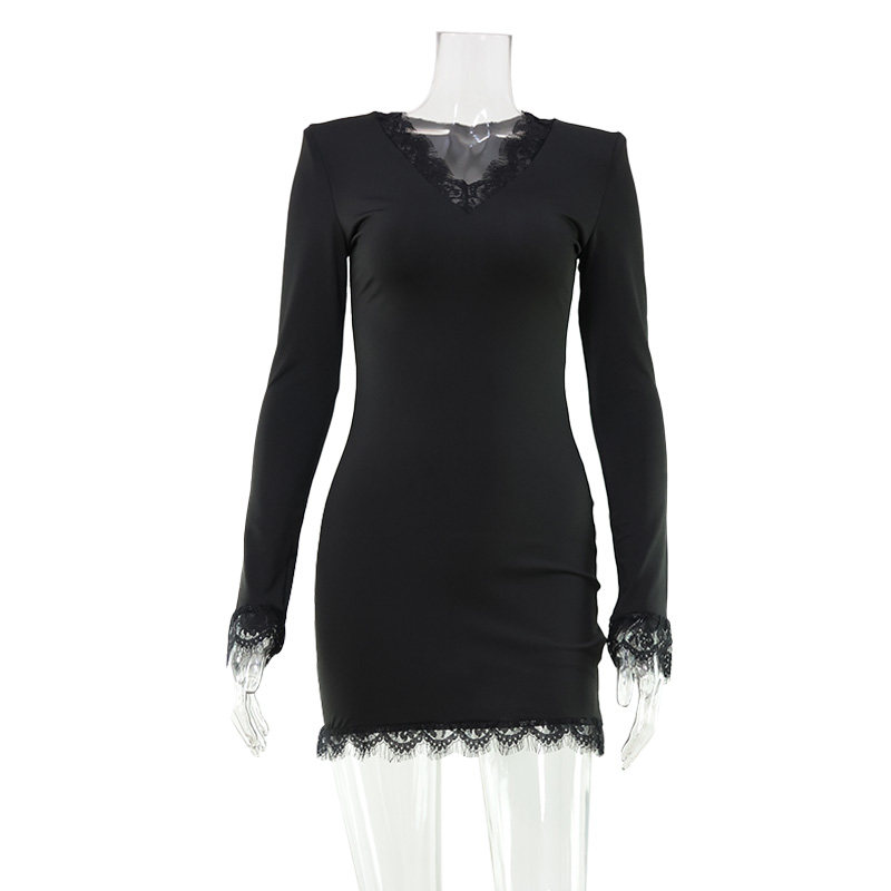 收腰欧美气质包臀裙子 连衣裙辣妹修身 Ahagaga时尚 蕾丝拼接V领长袖