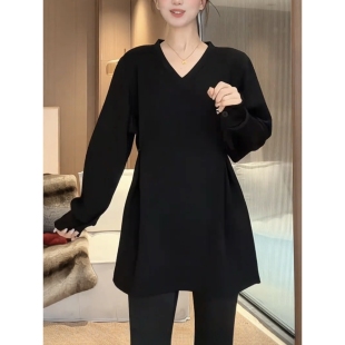 潮 卫衣T恤女收腰显瘦开叉打底衫 纯色慵懒风V领加绒加厚中长款 长袖