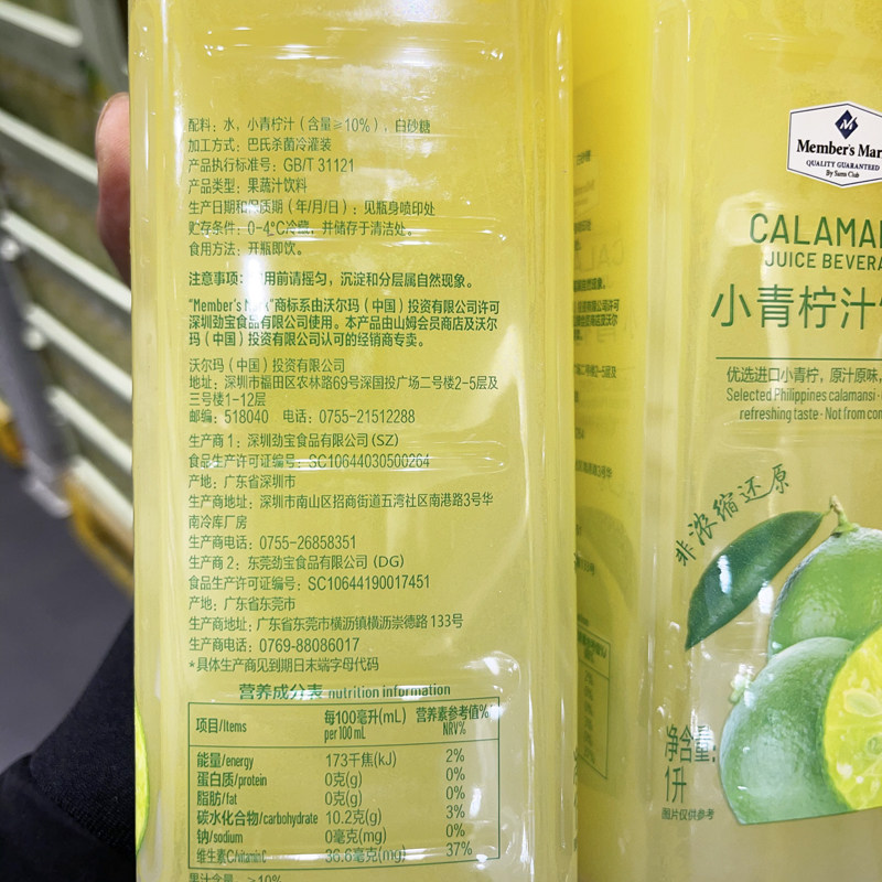 山姆代购 小青柠汁饮料大瓶1升果汁柠檬水维生素C西柚汁酸柑水