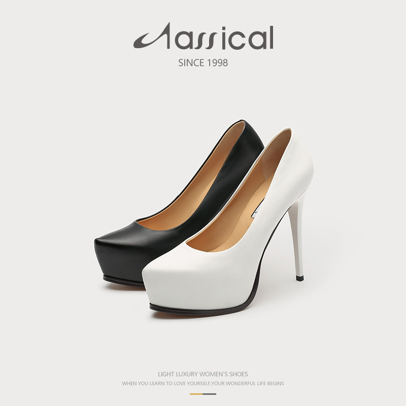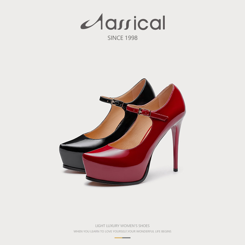 卡斯高真皮牛皮超高跟厚防水台恨天高细跟一字带玛丽珍通勤女单鞋