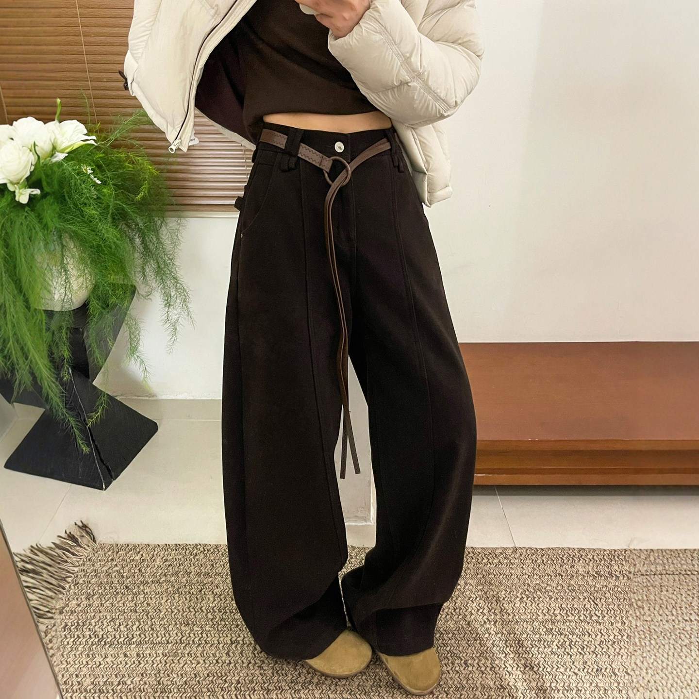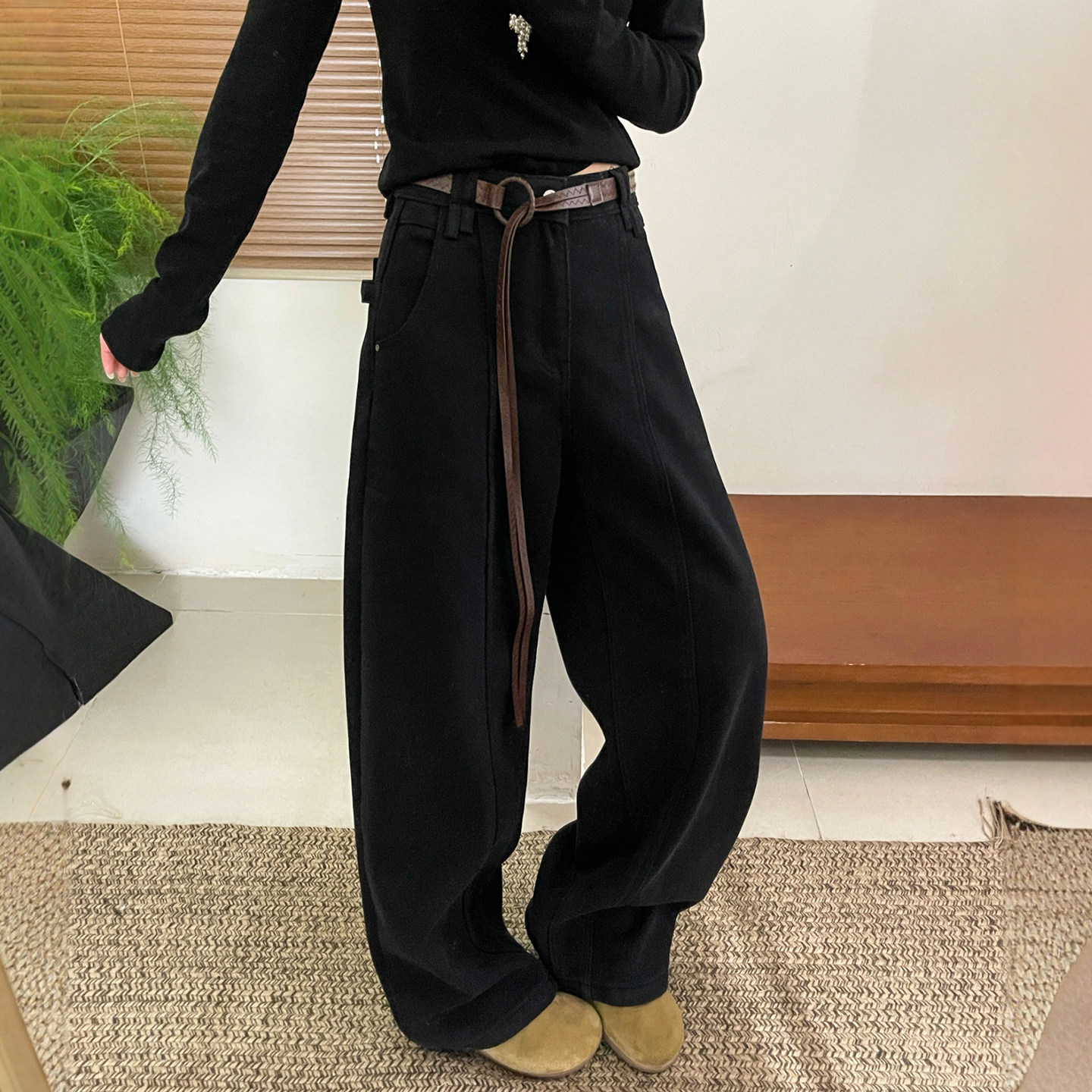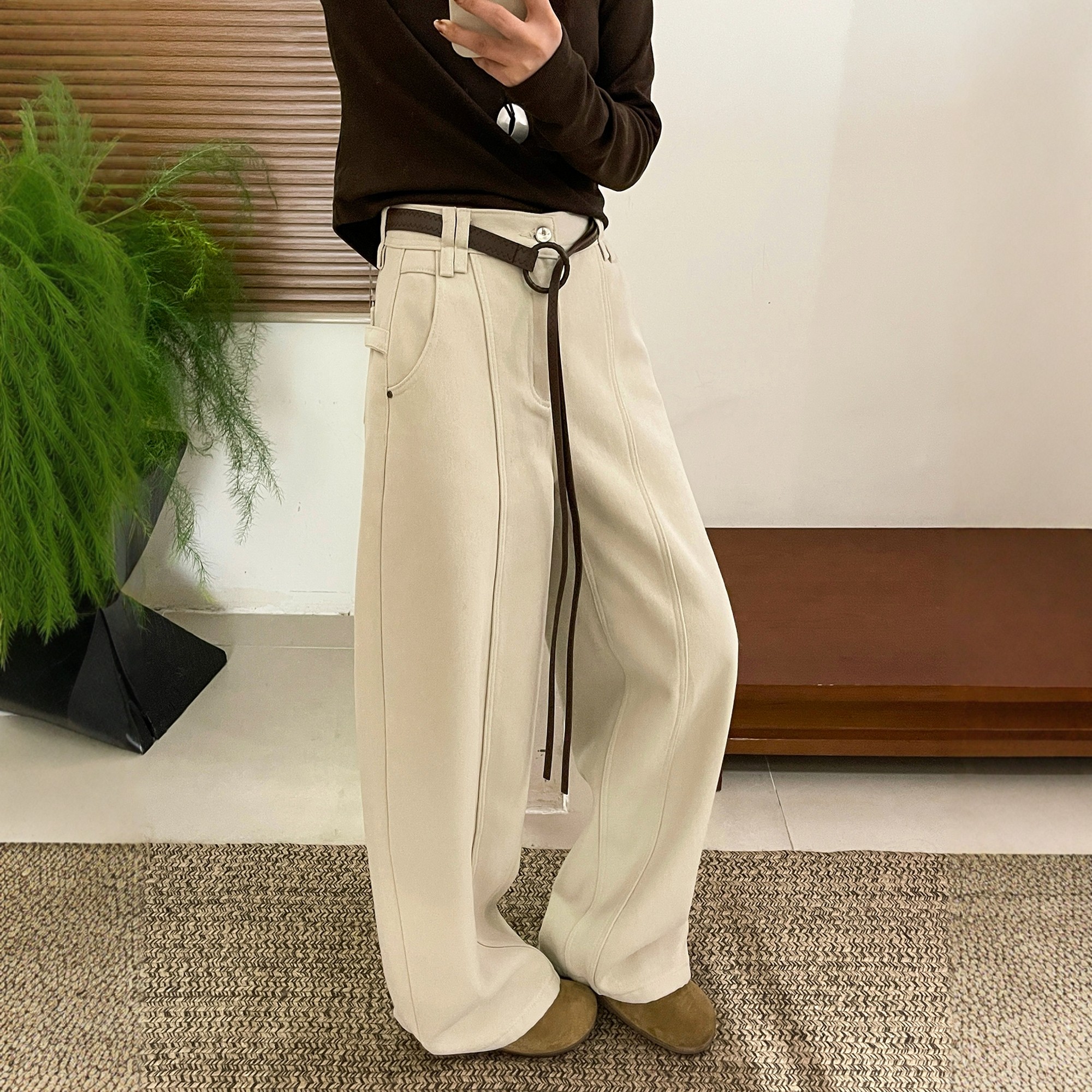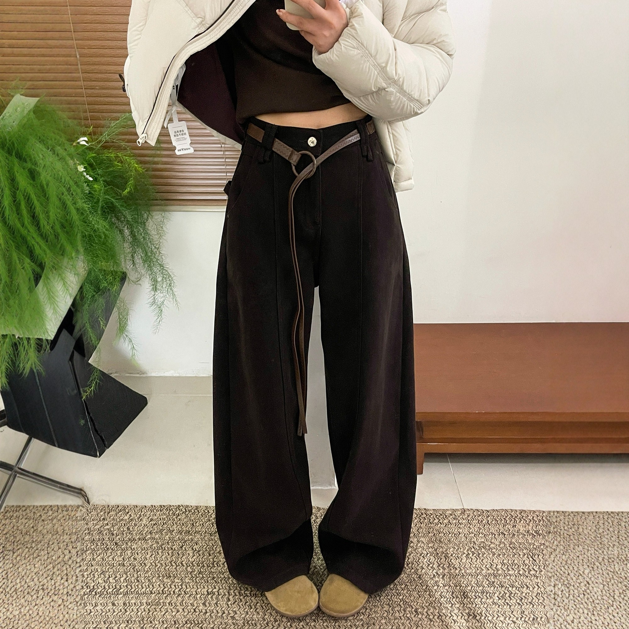 加厚直筒裤 配腰带加绒阔腿牛仔裤 欧货女装 新款 潮 女欧洲站2025冬装