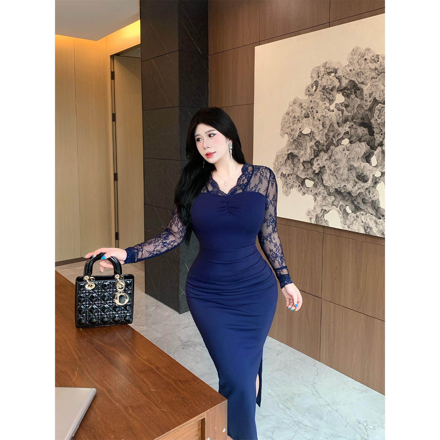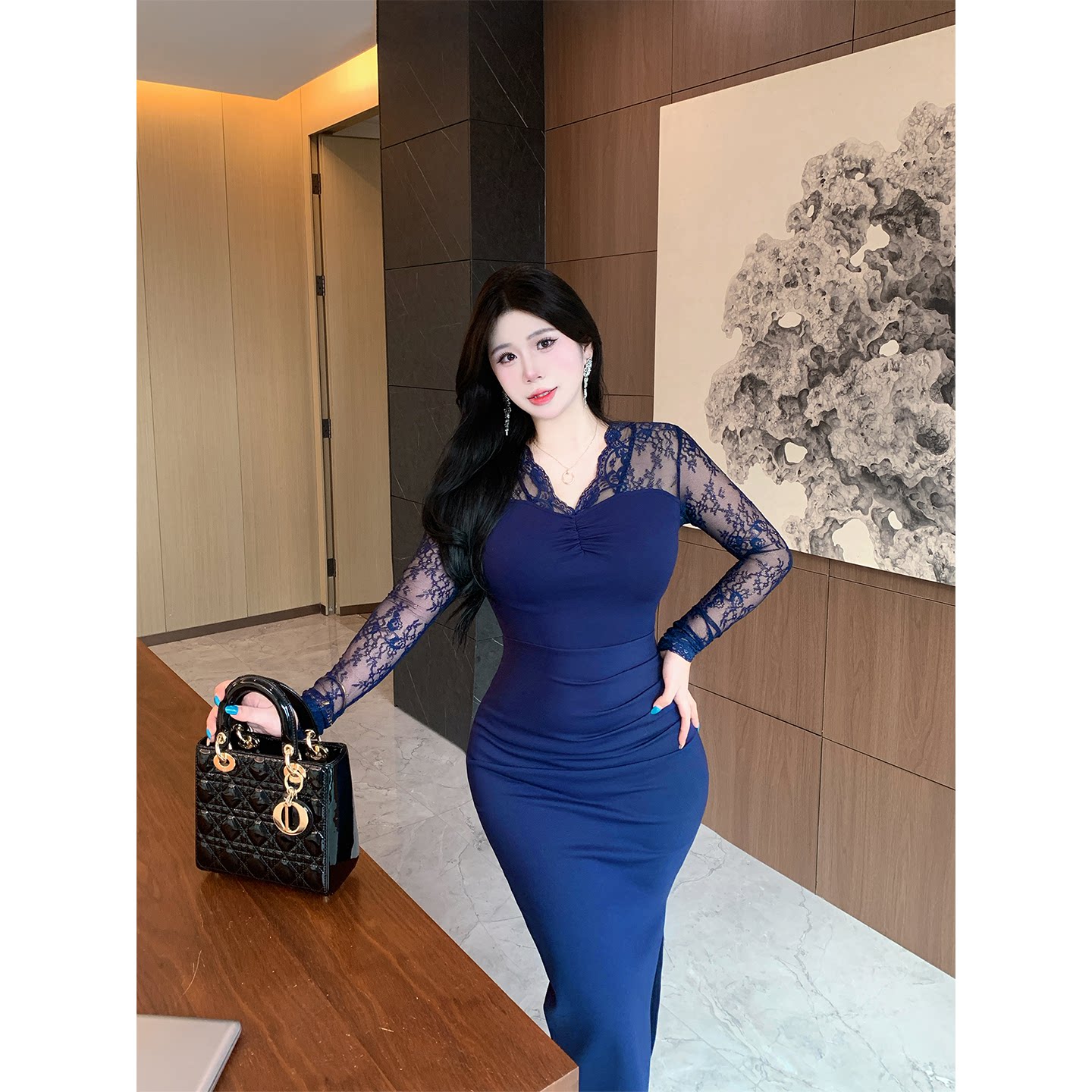 性感气质高级感女人味修身 舒缓协奏 蕾丝v领连衣裙女冬 babes