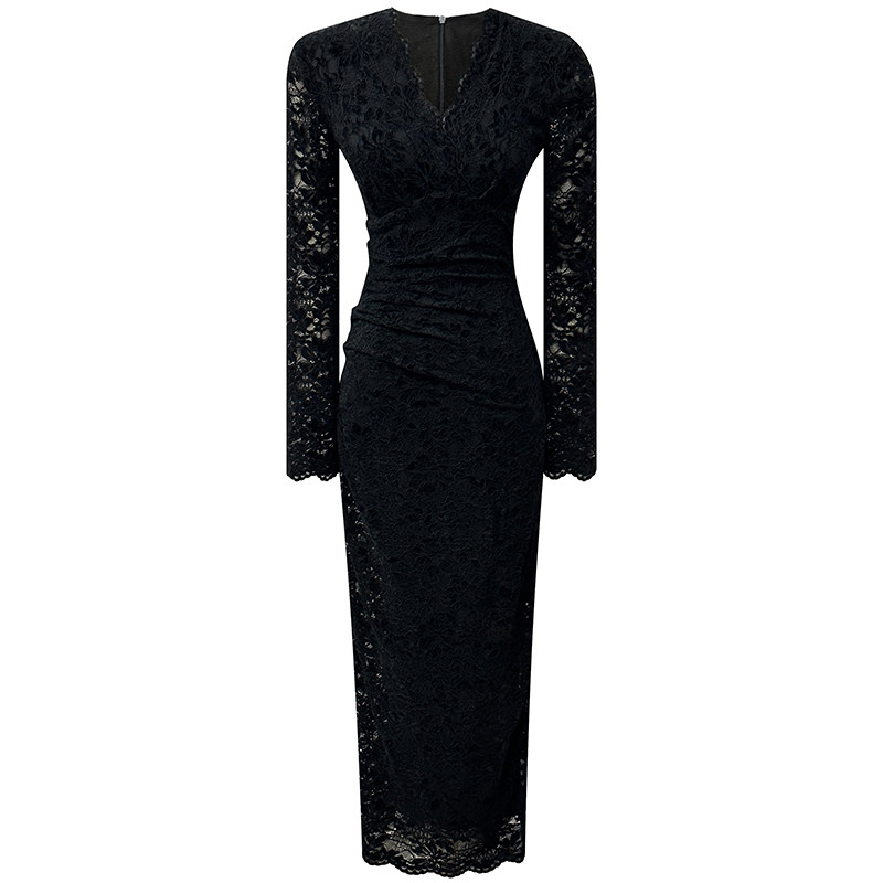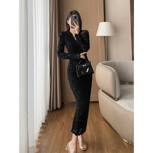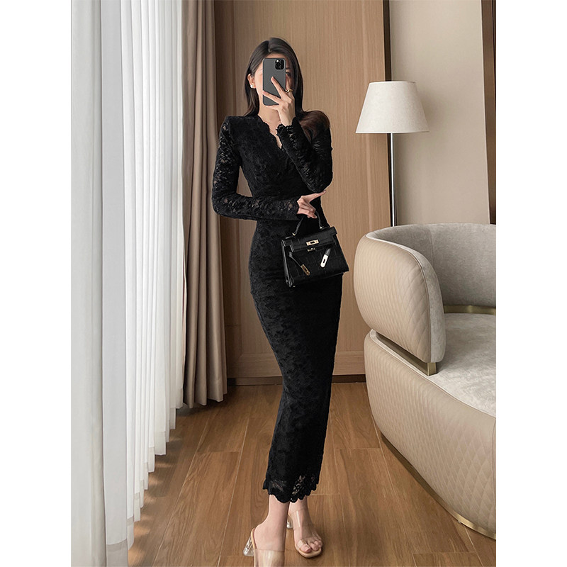 蕾丝V领长袖 新款 收腰包臀裙中长裙 连衣裙女冬季 白色加绒加厚修身