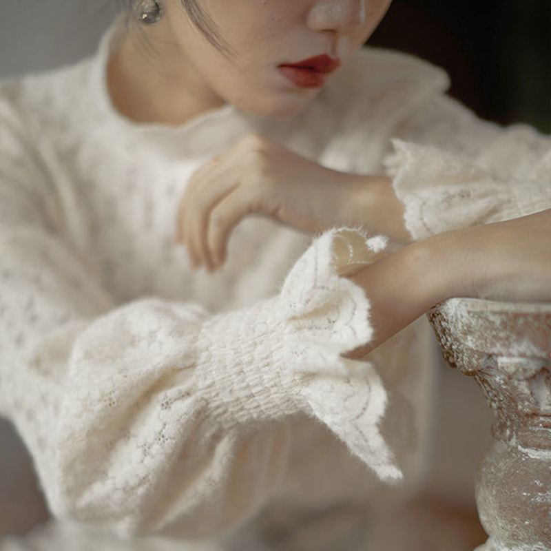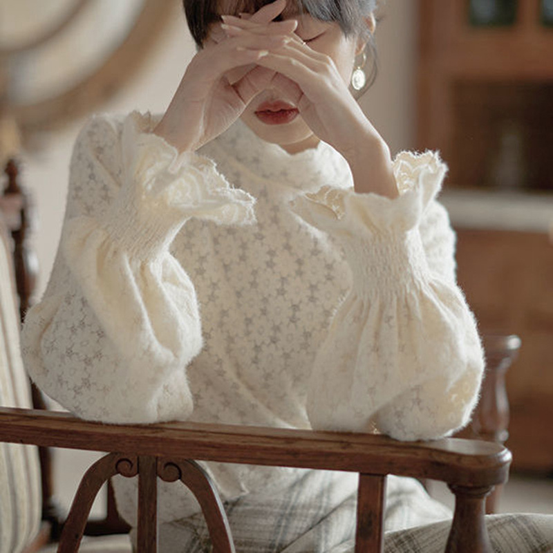 衬衫 套头上衣宽松长袖 女内搭秋冬洋气泡泡袖 百搭磨毛打底蕾丝衫
