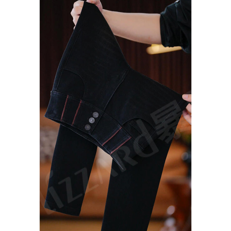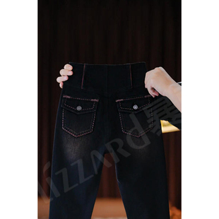 四面弹 小个子八九分薄绒法棍直筒裤 加绒加厚黑色烟管牛仔裤 女冬季