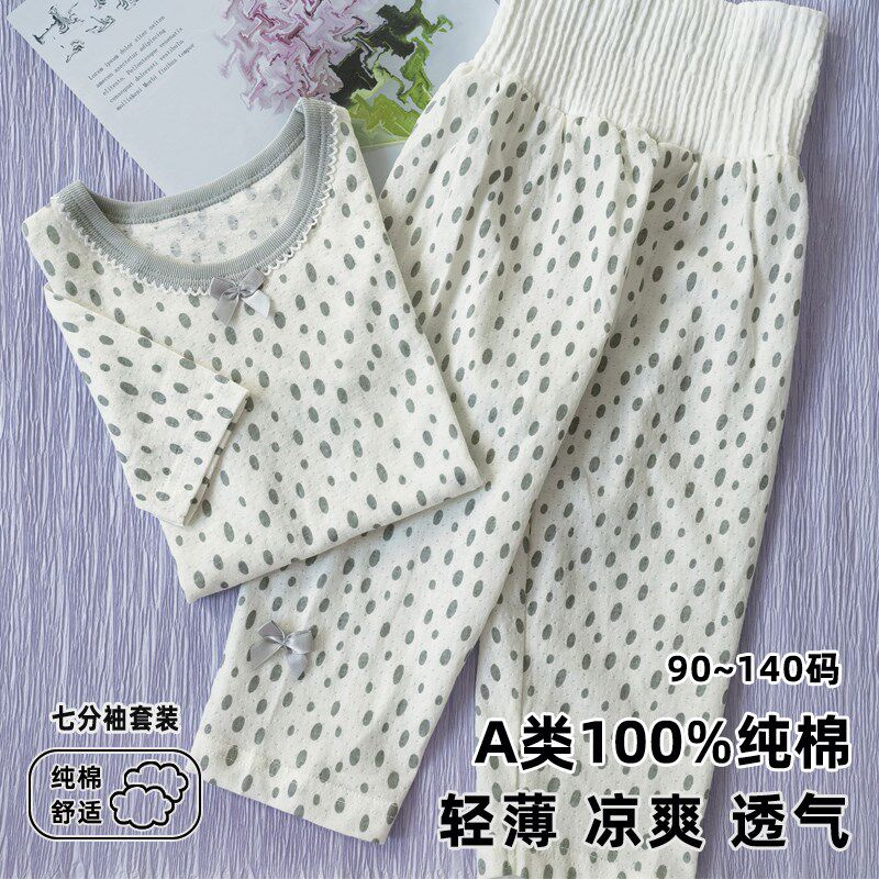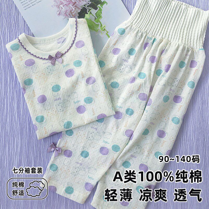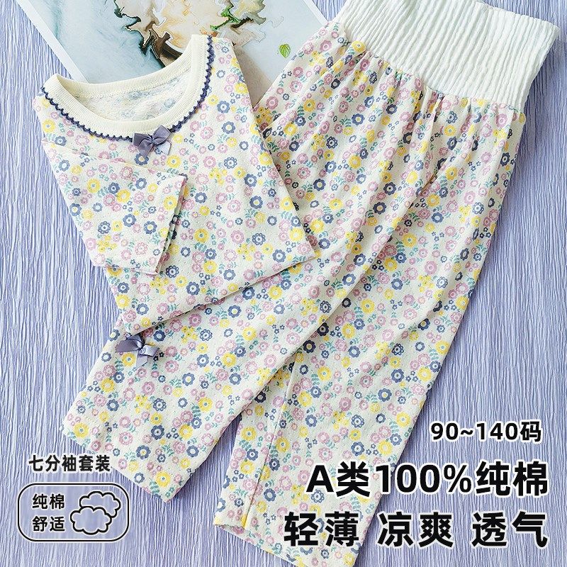 儿童七分空调服宝宝纯棉高腰护肚睡衣睡裤 女童春夏薄款 家居服套装