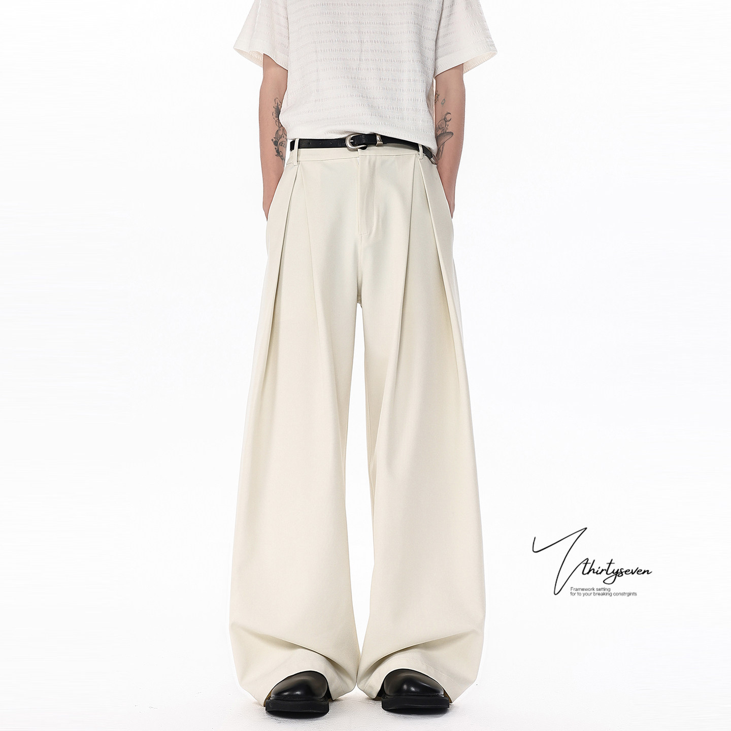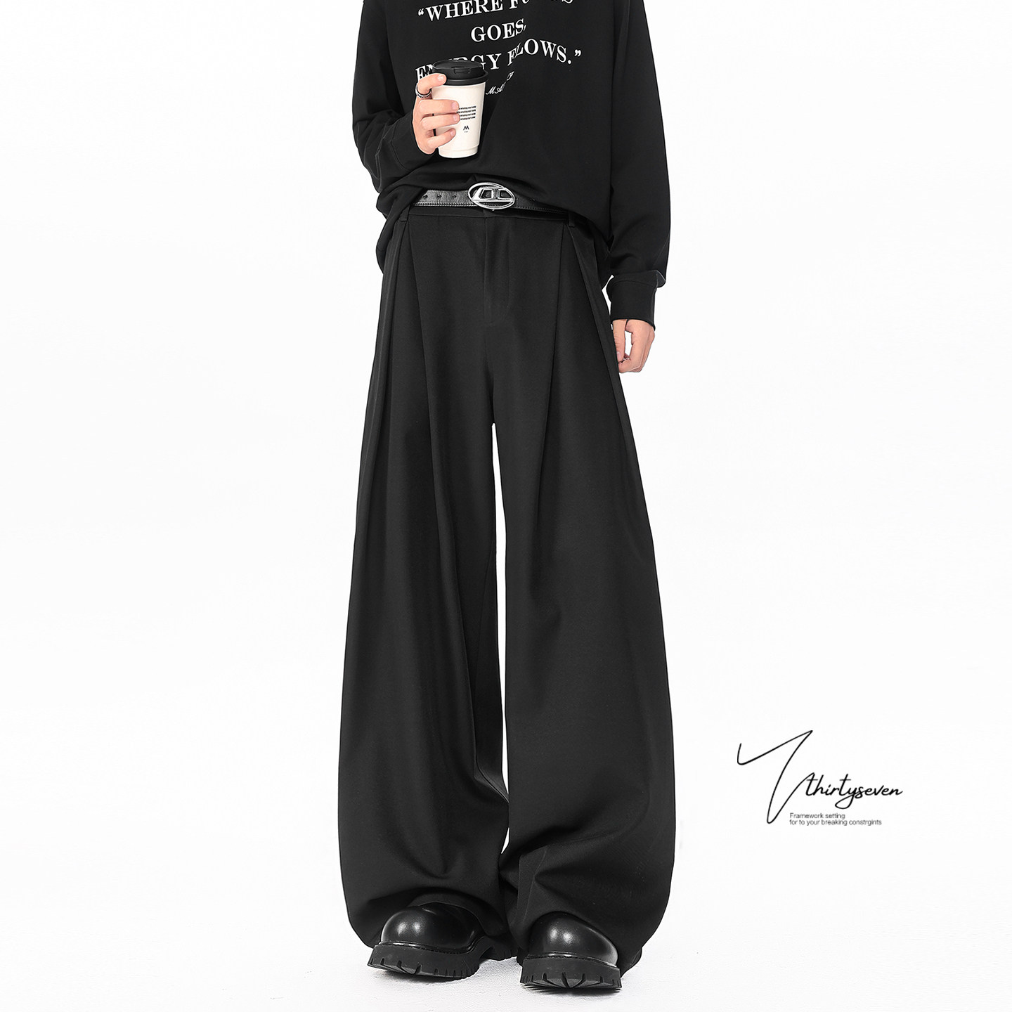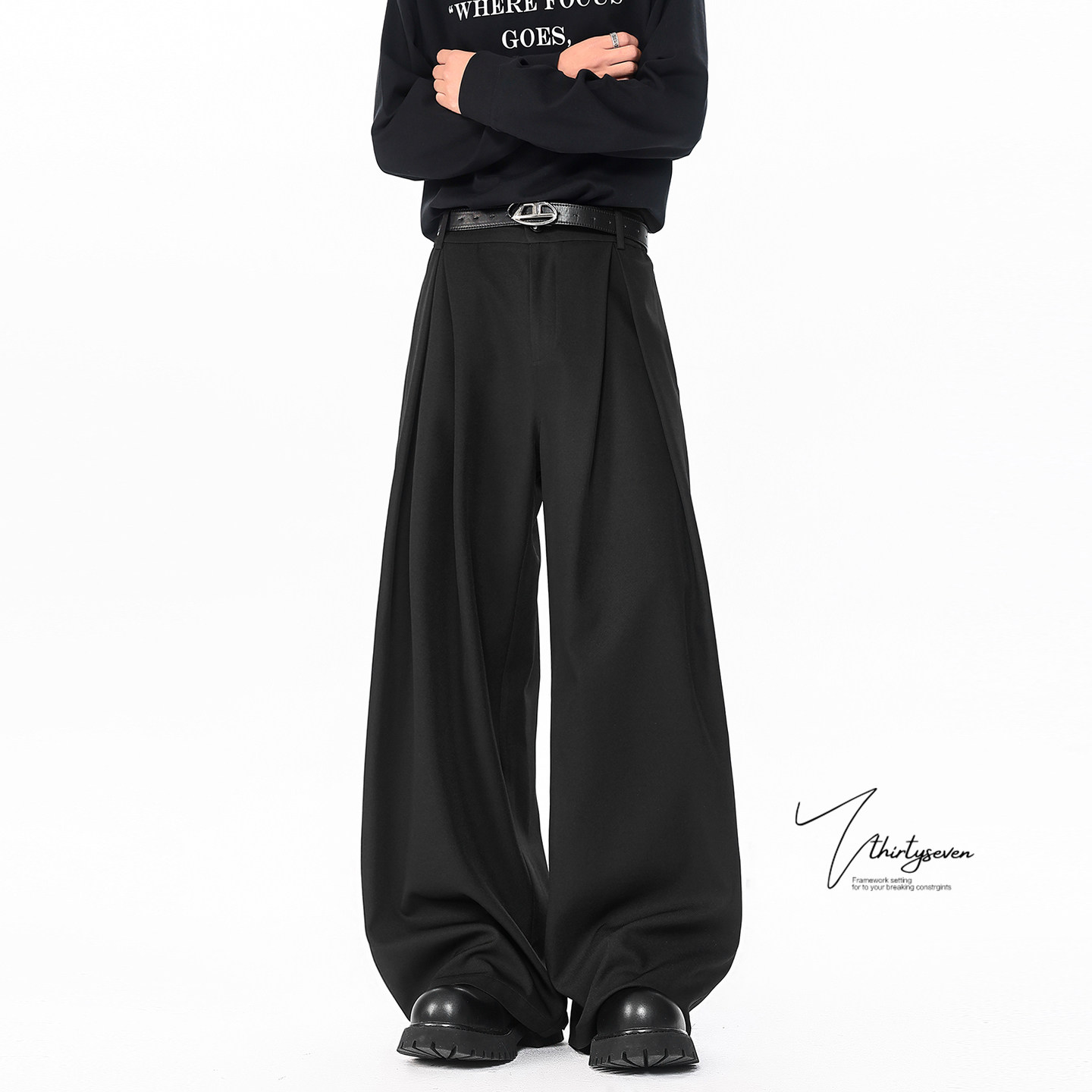 宽松垂坠感通勤阔腿长裤 男春季 潮 高街黑色立体A字褶皱西裤 V37美式