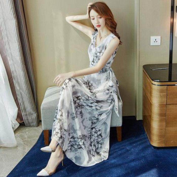 气质长款 蕾丝V领温柔风收腰显瘦大裙摆长袖 连衣裙 薄雾云纱 白里