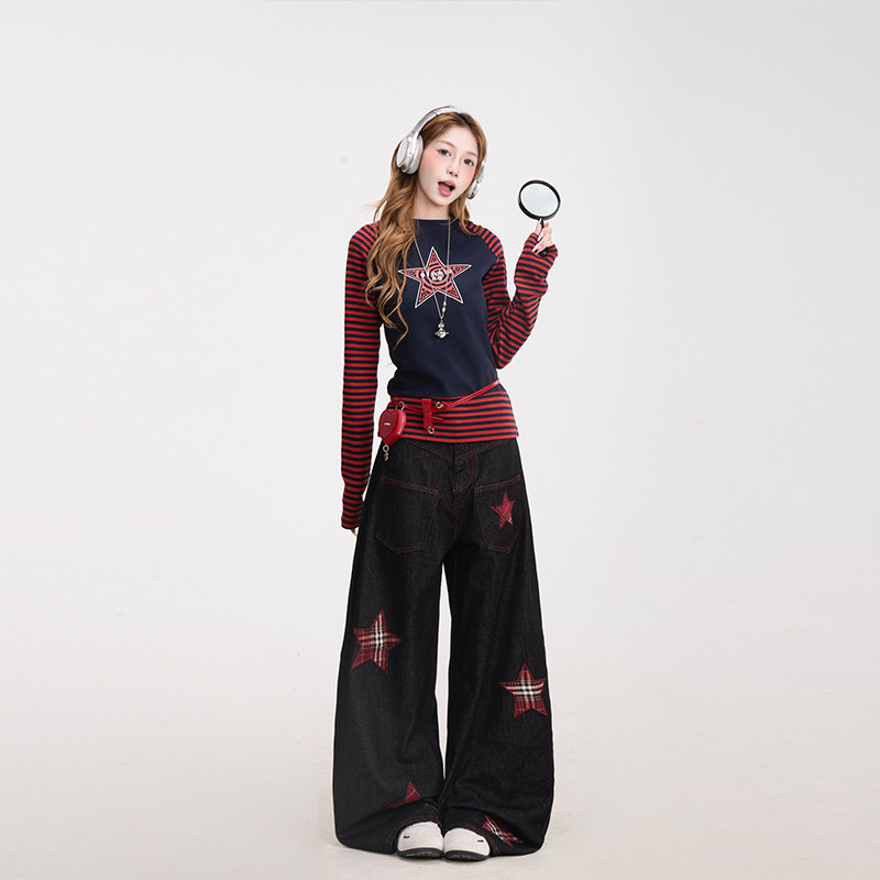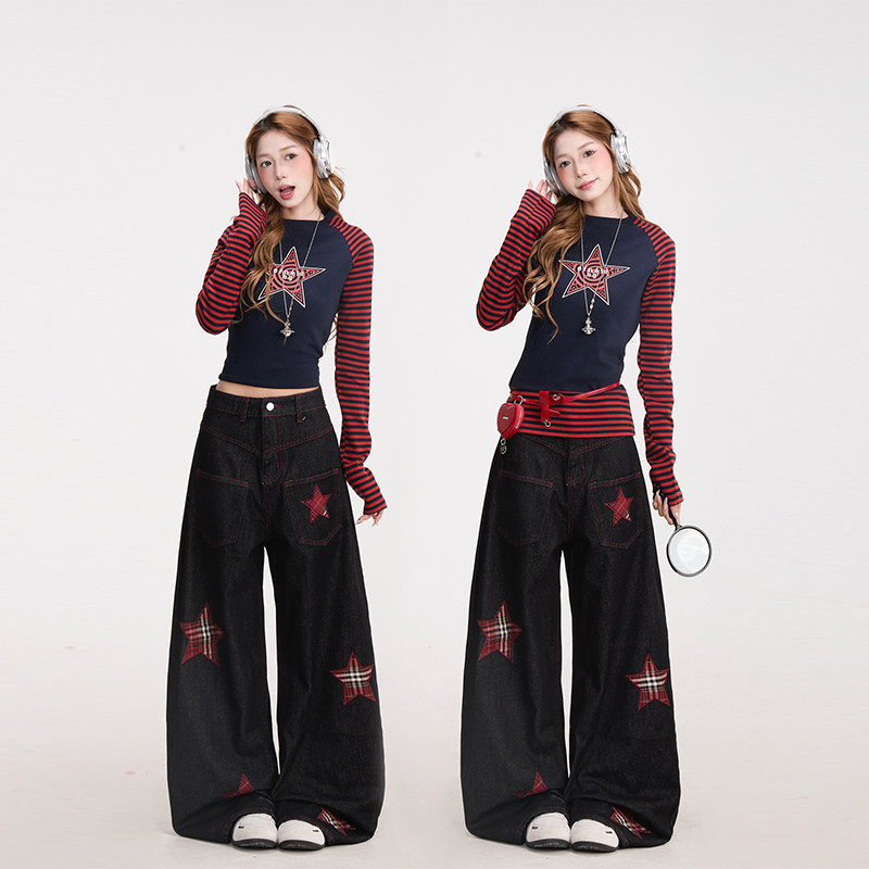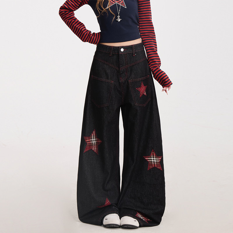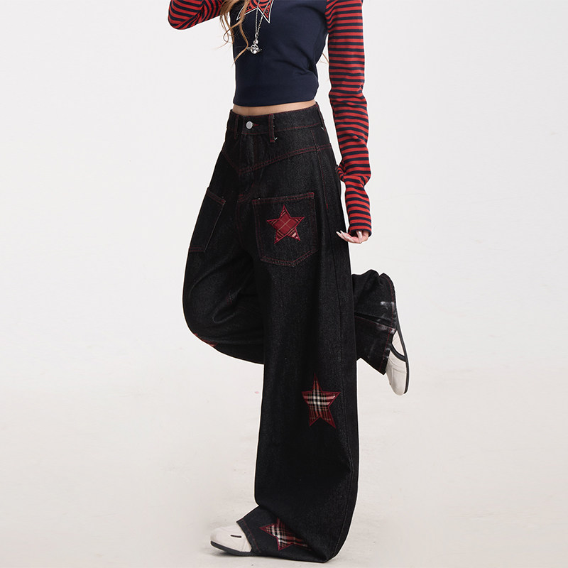 潮牌显瘦宽松阔腿裤 NERESUM格纹五角星贴布绣弯刀牛仔裤 女美式