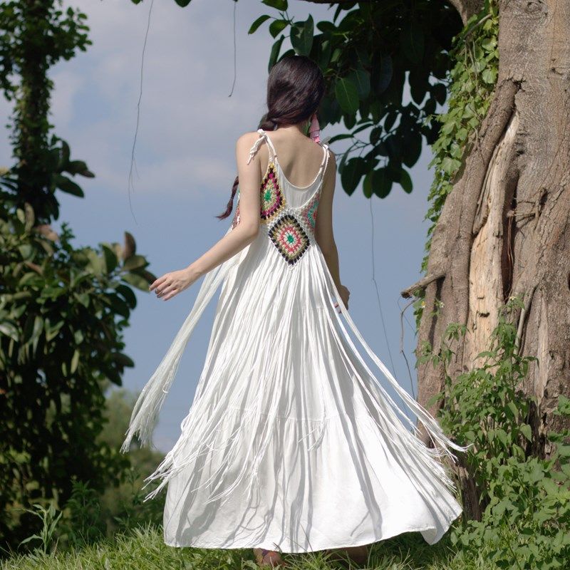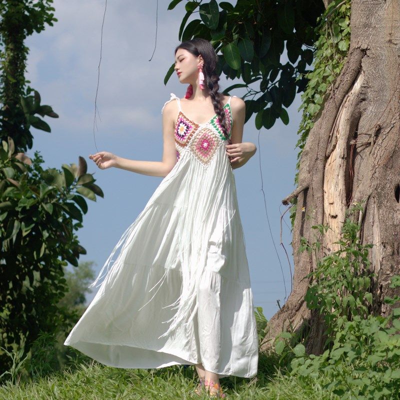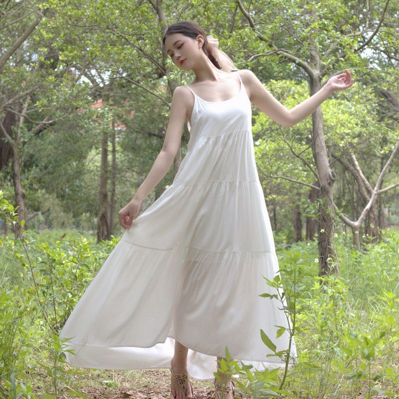 白色波西米亚度假旅游复古宽松蛋糕裙连衣裙海边沙滩吊带海滩收腰