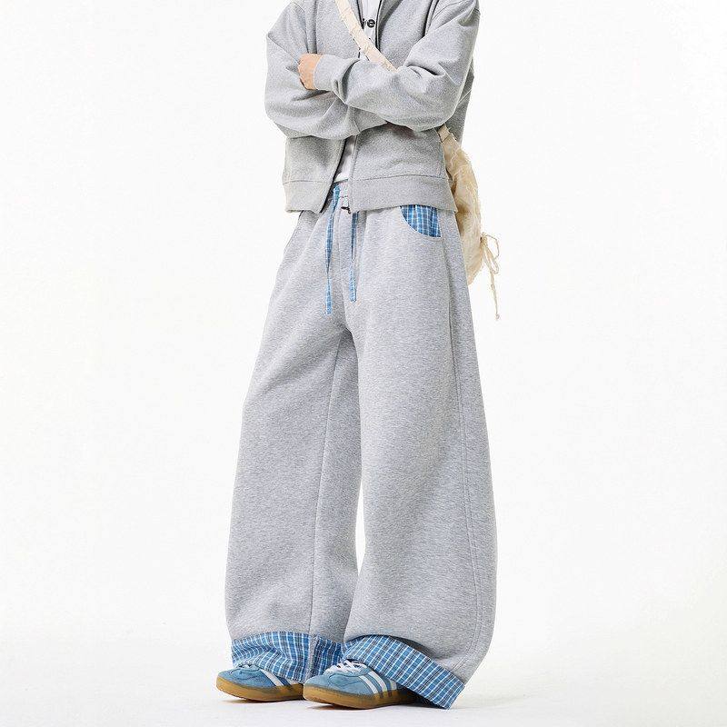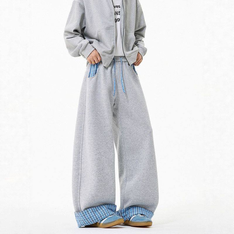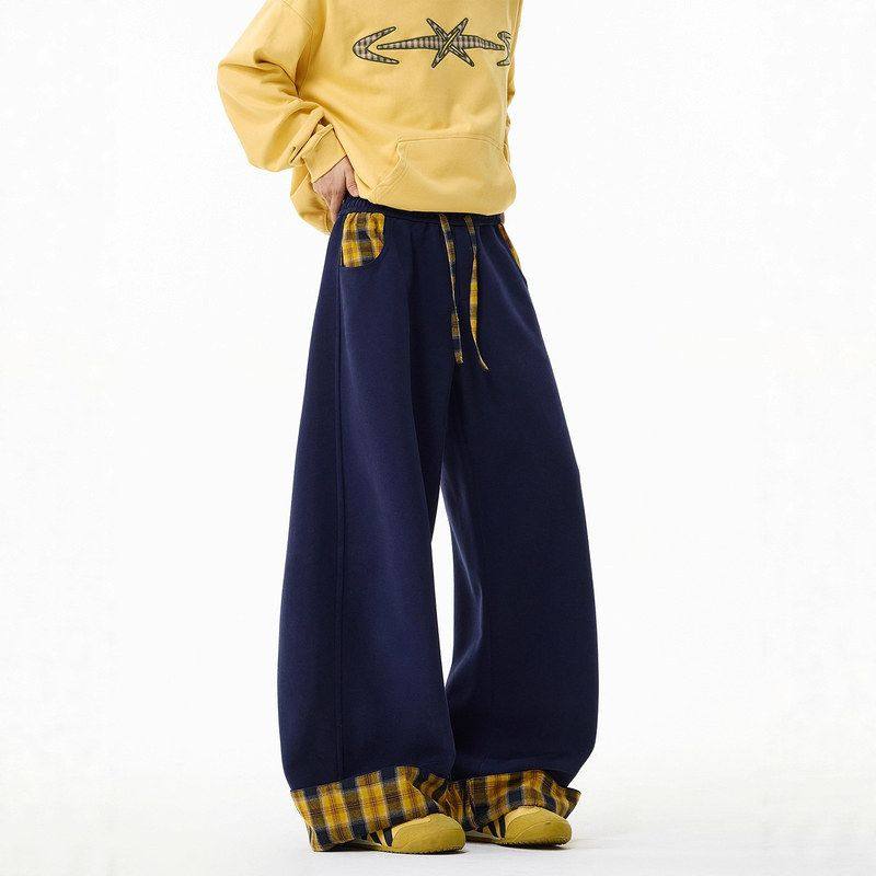 潮牌拼接子长裤 高街休闲裤 男女复古hiphop格纹阔腿裤 运动冬季 美式