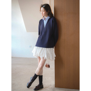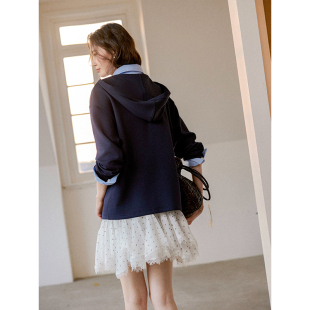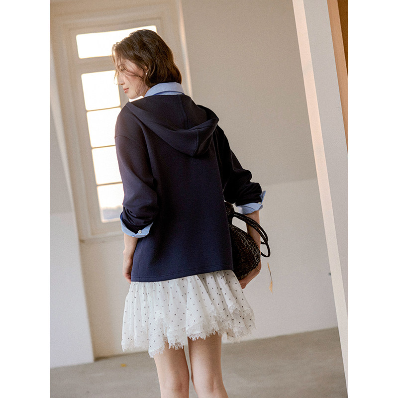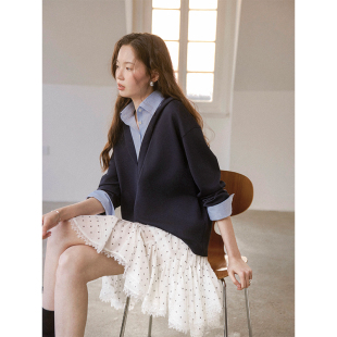 针梭拼接假两件V领衬衫 天丝棉混纺 连帽卫衣 Vintage Even