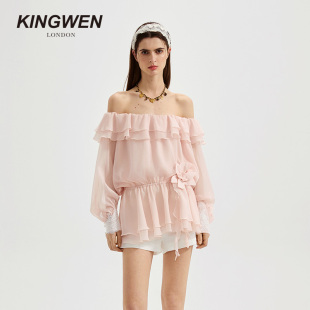 高级感蕾丝衫 一字肩上衣女粉色细闪鸢尾长袖 新款 KINGWEN2026春季