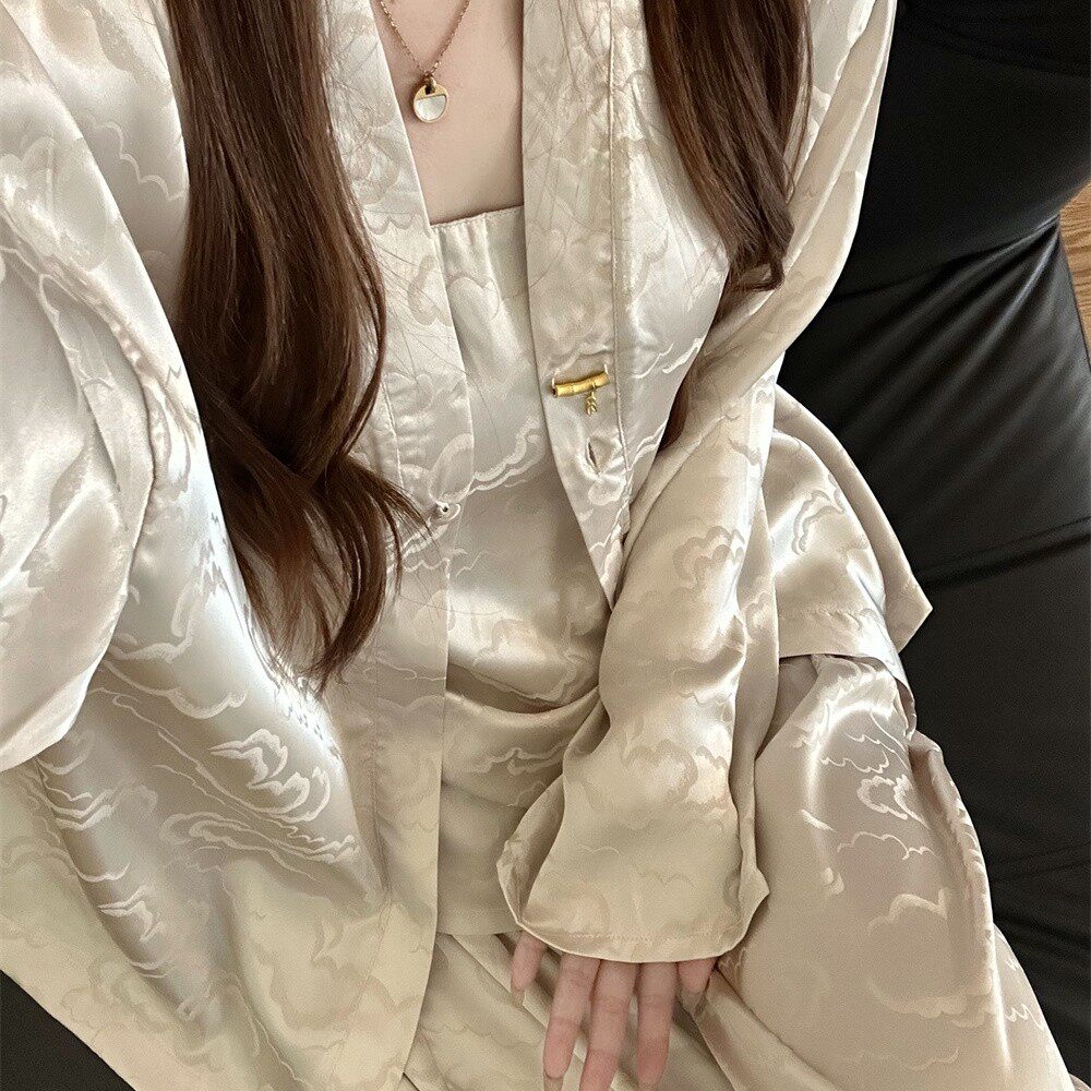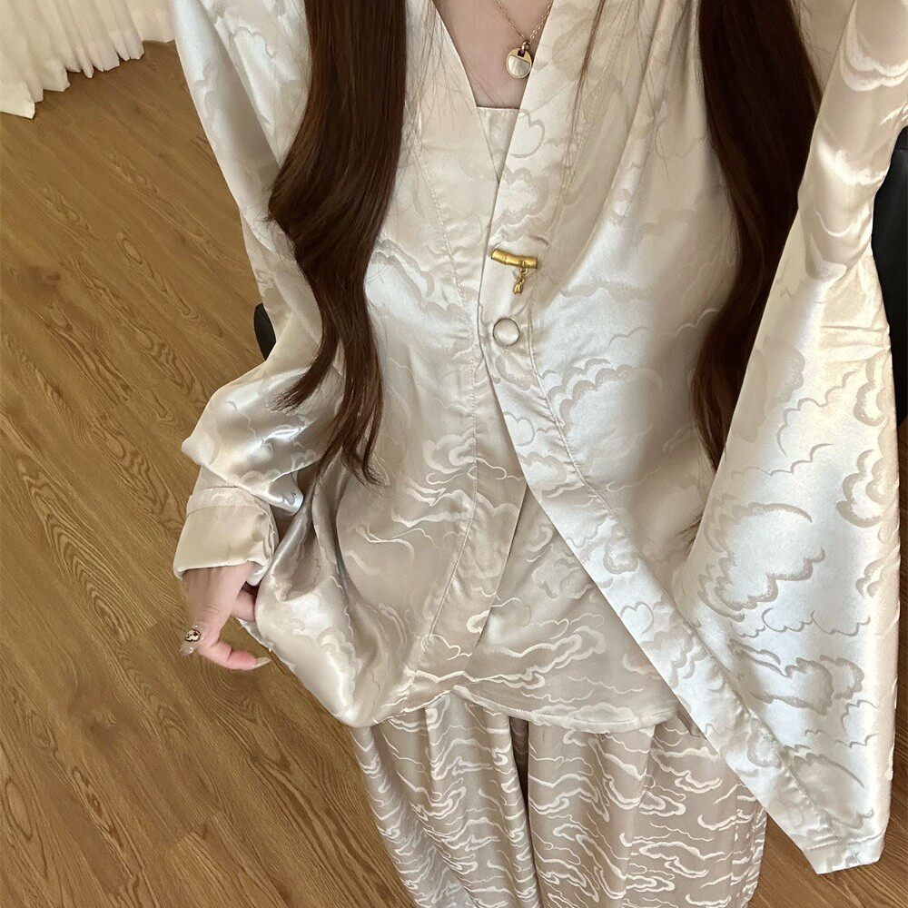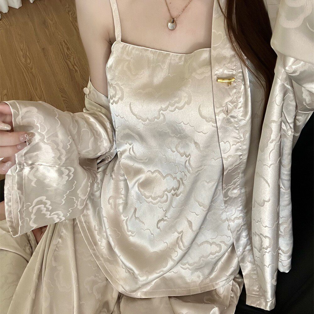 三件套真丝睡衣女国风轻奢盘扣桑蚕丝带胸垫吊带春秋季 家居服 长袖