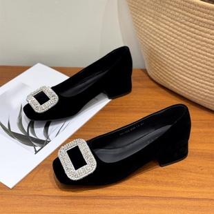 中跟方头浅口绒面百搭单鞋 法式 春季 女2026新款 粗跟洋气水钻高跟鞋