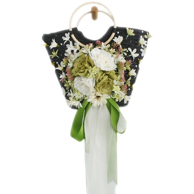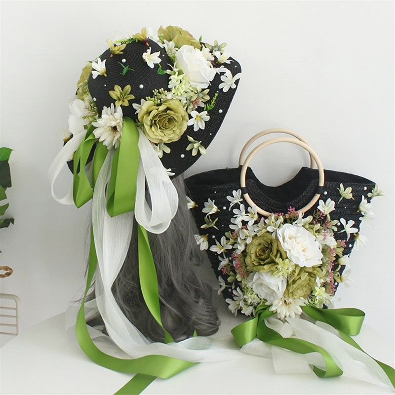 手工花朵草编包黑色木手提沙滩包度假旅行编织草包夏季 女拍照橱窗