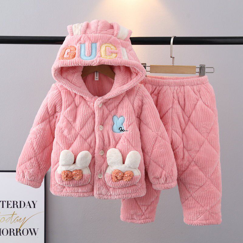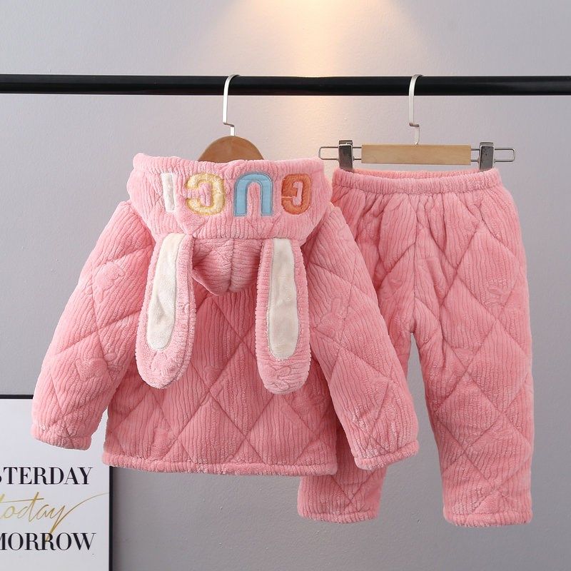 冬季 女童中大童小白兔连帽家居服 儿童睡衣法兰绒三层加厚夹棉套装
