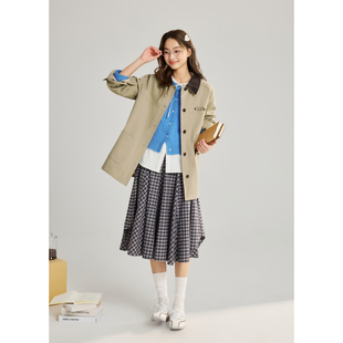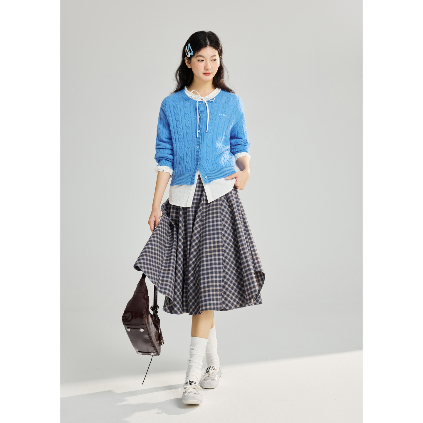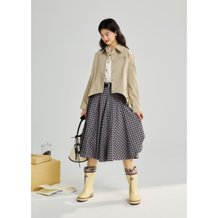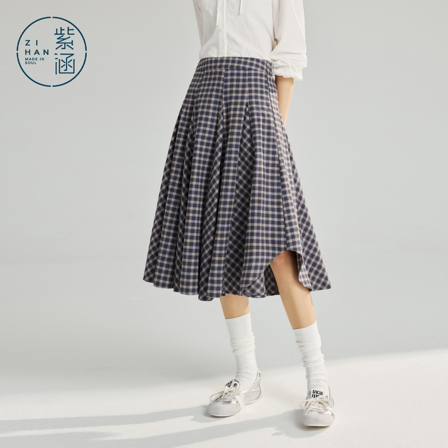紫涵100%纯棉灰格七分半身裙女2026春季 不规则裙摆显瘦a字裙 新款