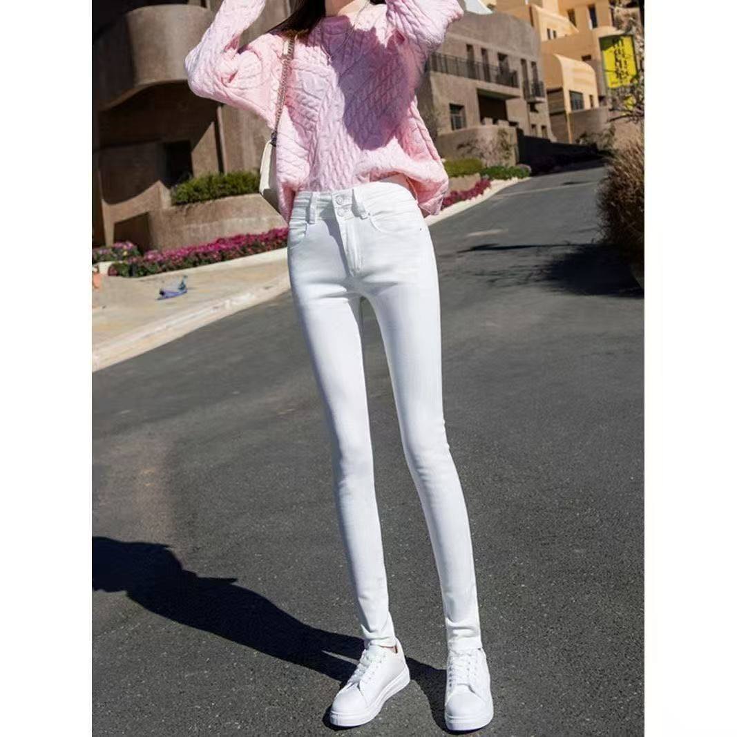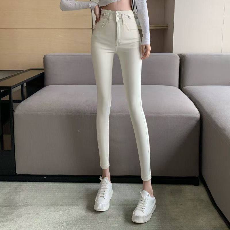 双扣铅笔裤 牛仔裤 基础百搭收腰显瘦紧身白色小脚裤 韩国欧尼小白裤