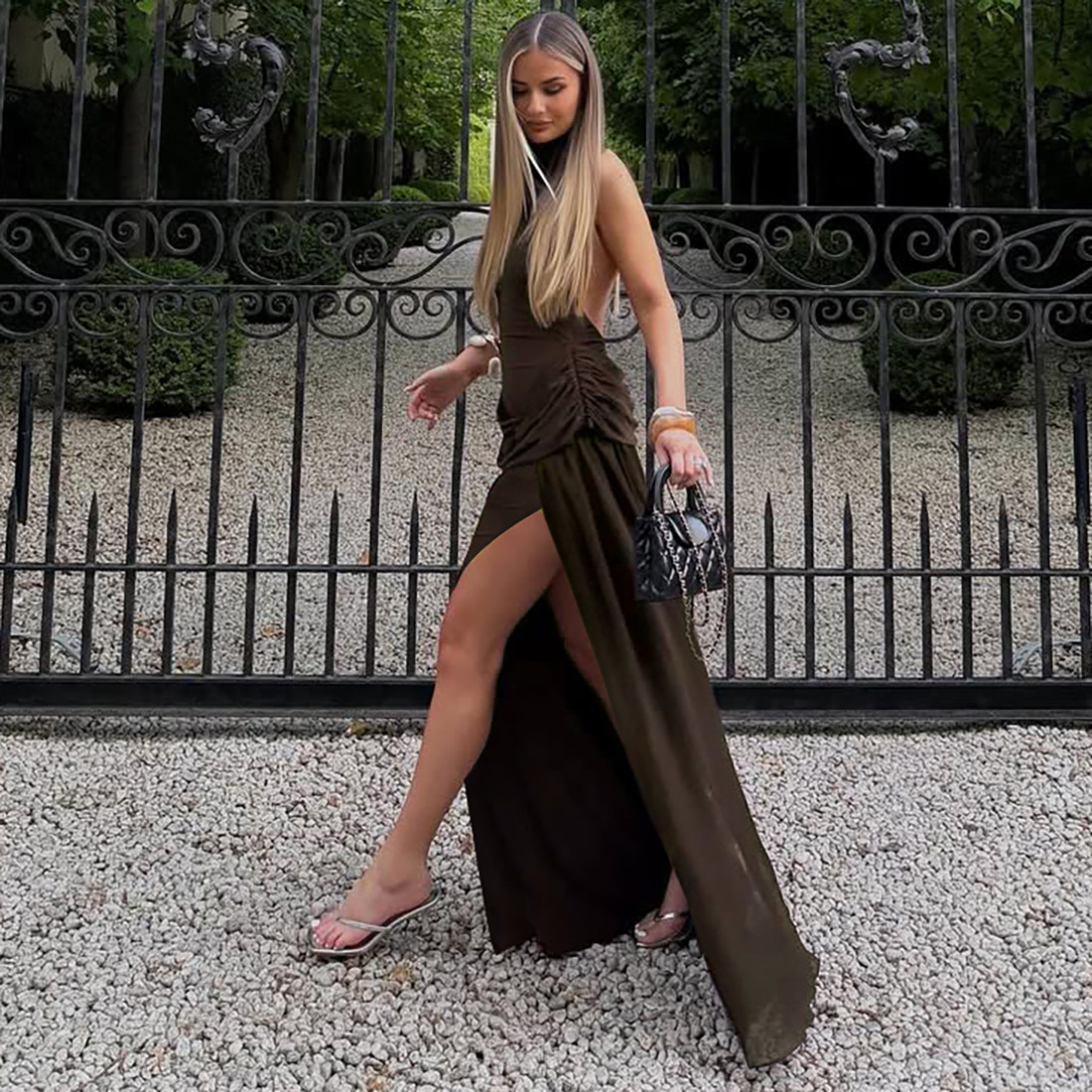 显瘦无袖 性感辣妹风褶皱修身 连衣裙开叉百搭气质长裙 法式 SylCue