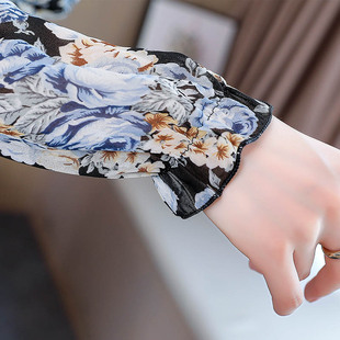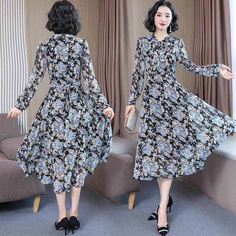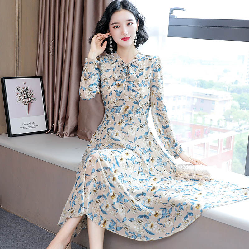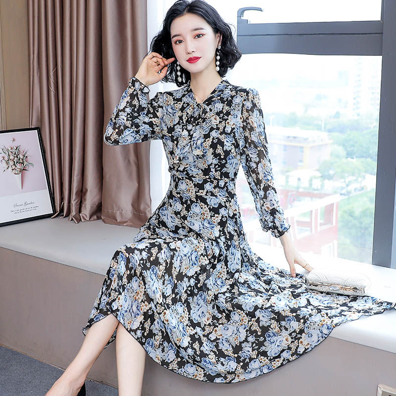 2020新款 长款 秋装 气质v领收腰显瘦大码 碎花裙 时尚 雪纺连衣裙长袖