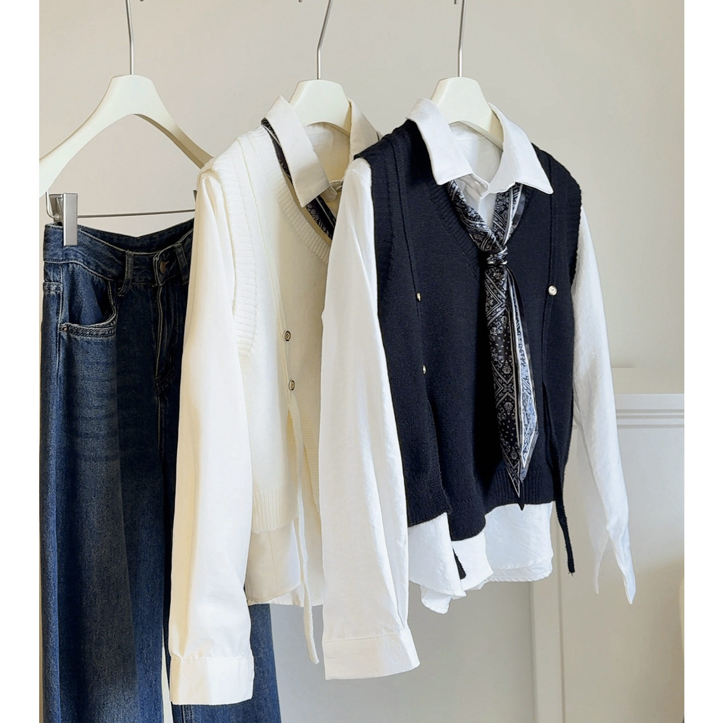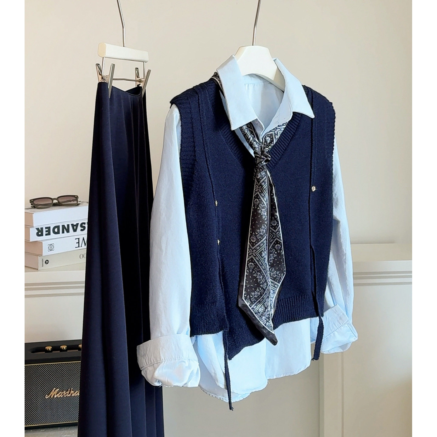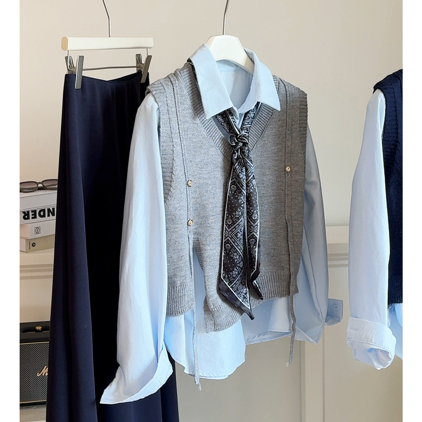 衬衣 显瘦减龄百搭长袖 丝巾三件套 韩系开叉气质针织马甲背心 秋季