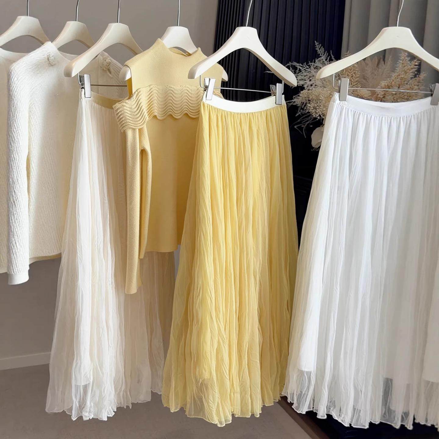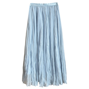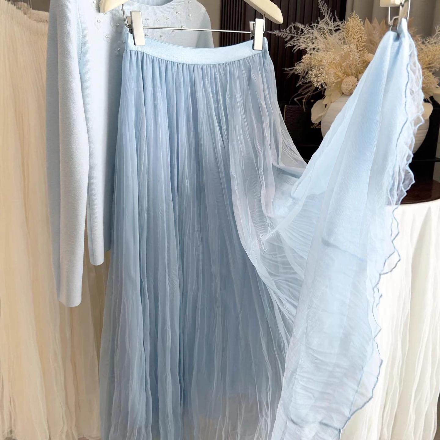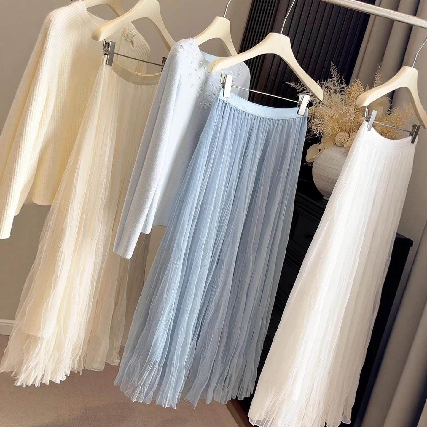 超仙网纱纯色百褶裙女2026春款 半身裙 高腰显瘦A字遮胯中长款