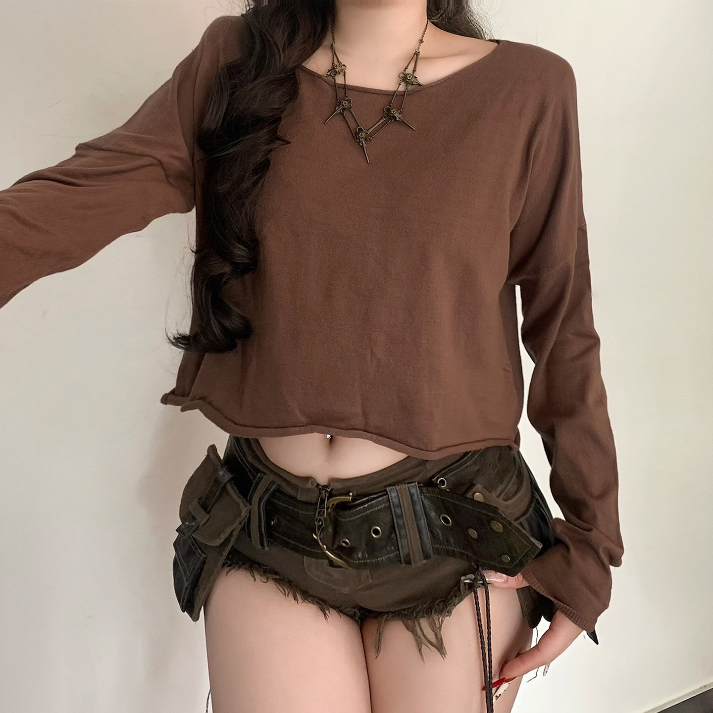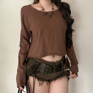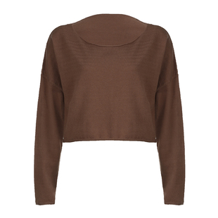 毛织上衣女 棕色圆领宽松长袖 松弛感百搭T恤 基础复古 ROCKMORE