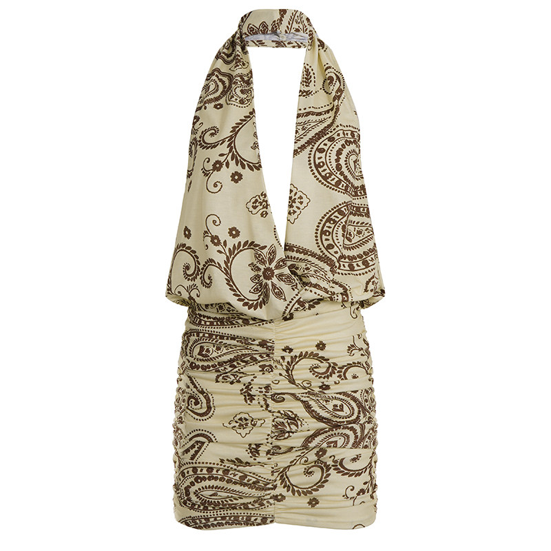 FabGirls 辣妹百搭显瘦包臀裙短裙 波西米亚腰果花印花挂脖连衣裙